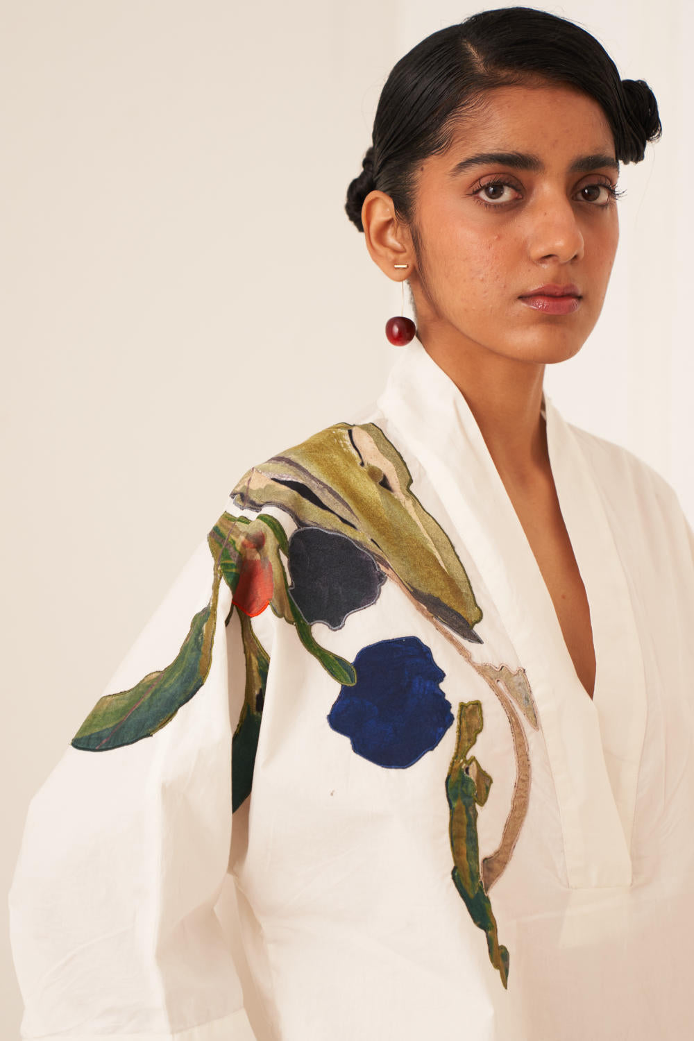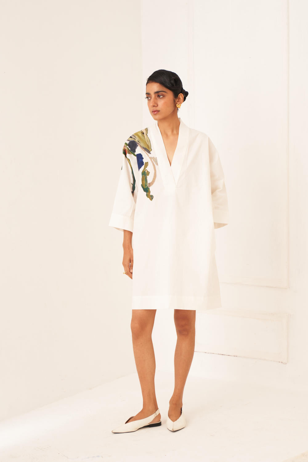 Mh Dress has an applique floral on the shoulder with single thread hand embroidery. This dress features V- neck, side seam pocket and Hand-embossed signature OFR lune embroidery detailing. Model is wearing size M.