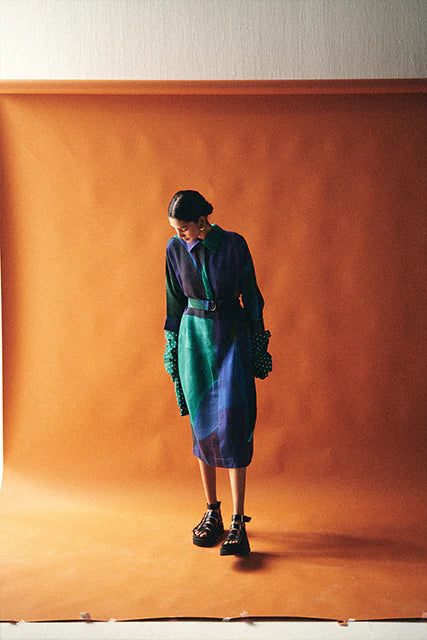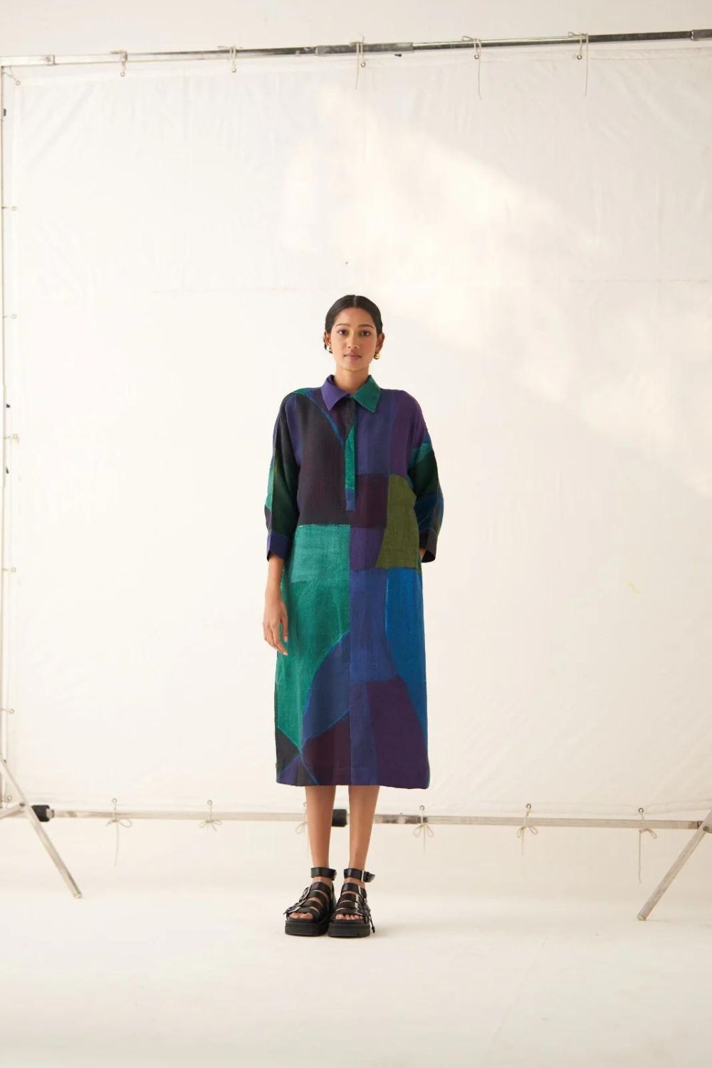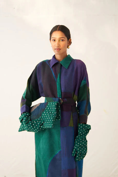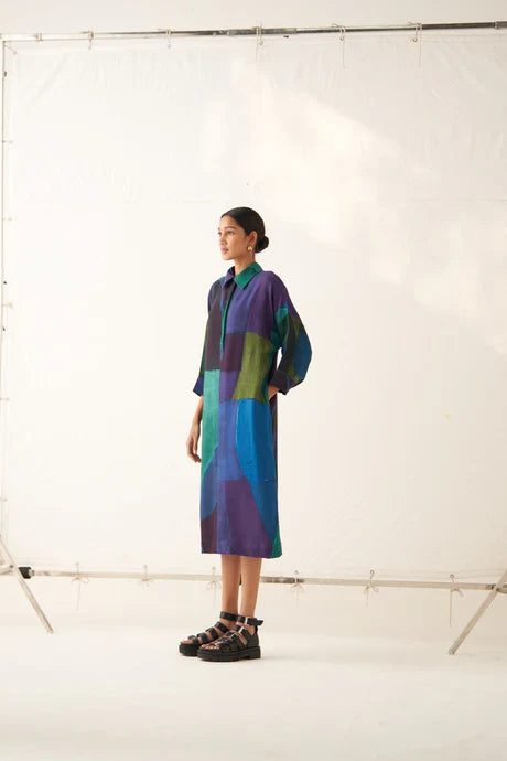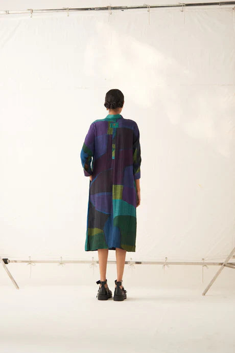 GOT Certified Azo-free dyes, Anti-Fit, Hand-painted abstract expressionist digitally transferred print, Shirt collar with half placket, Side seam pockets, Center back placket detailing, and Hand-embossed vintage Indian coin detail at back. Garment length is 45".