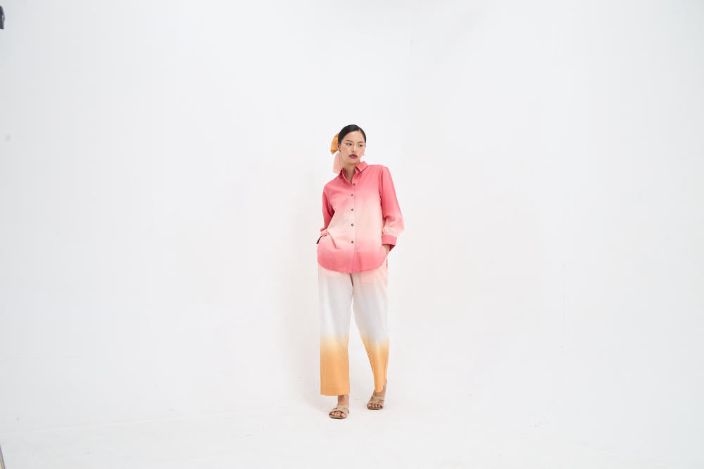 Crafted from fine cotton cambric, this ombre hand dyed set features a relaxed button-down shirt paired with matching gradient pants. Effortlessly stylish and comfortable, it’s perfect for a chic, casual look with a contemporary twist.