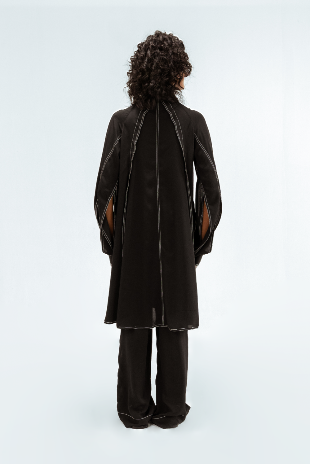 Wide-leg trousers finished with matching contrast stitch at the hem. Model Height is 5'9". Model wears size S. Garment length is (Pants 46")