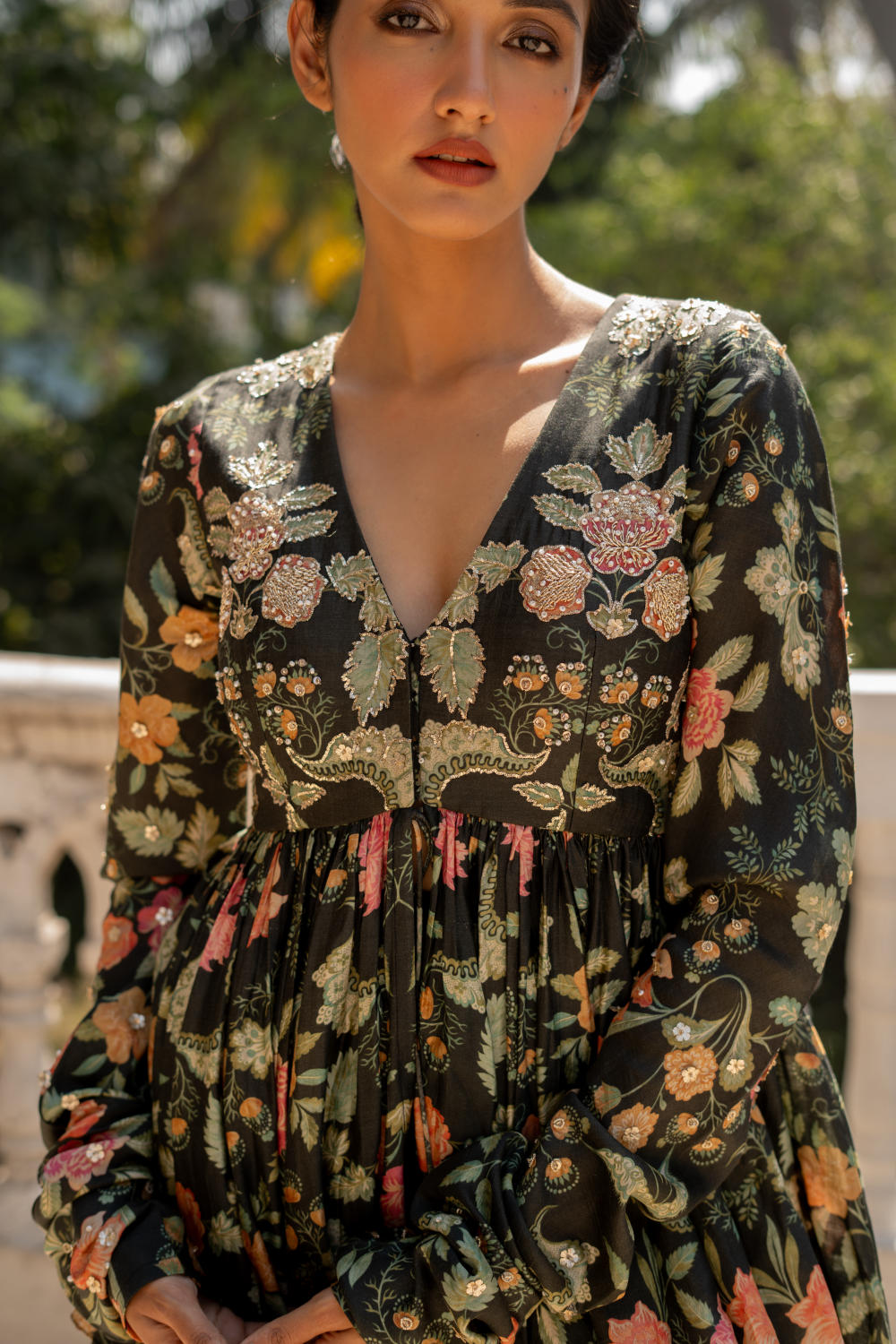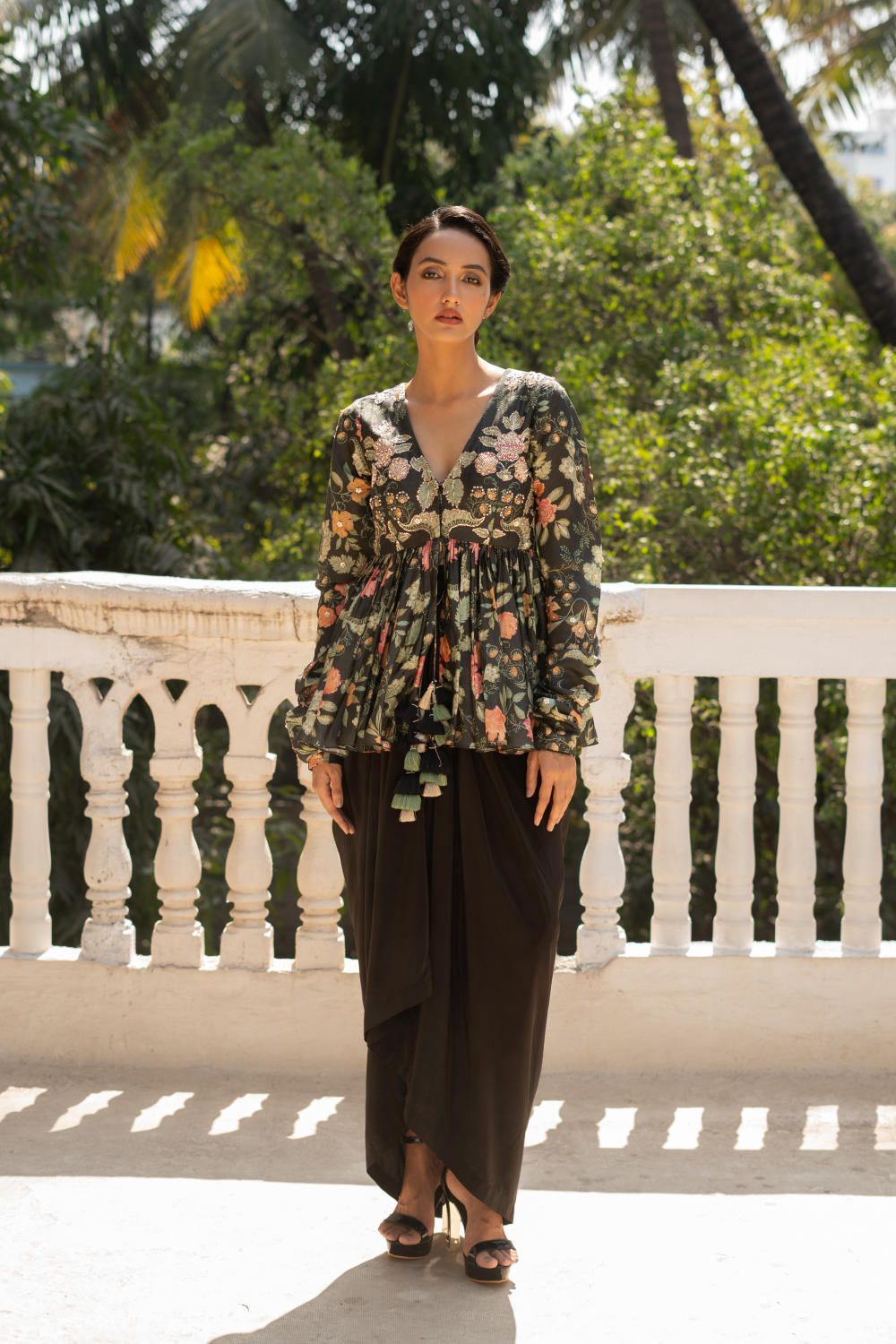 Featuring a black big floral print embroidered peplum set with zardosi embellishments and tassel drawstrings. It is paired with palazoo pants.
