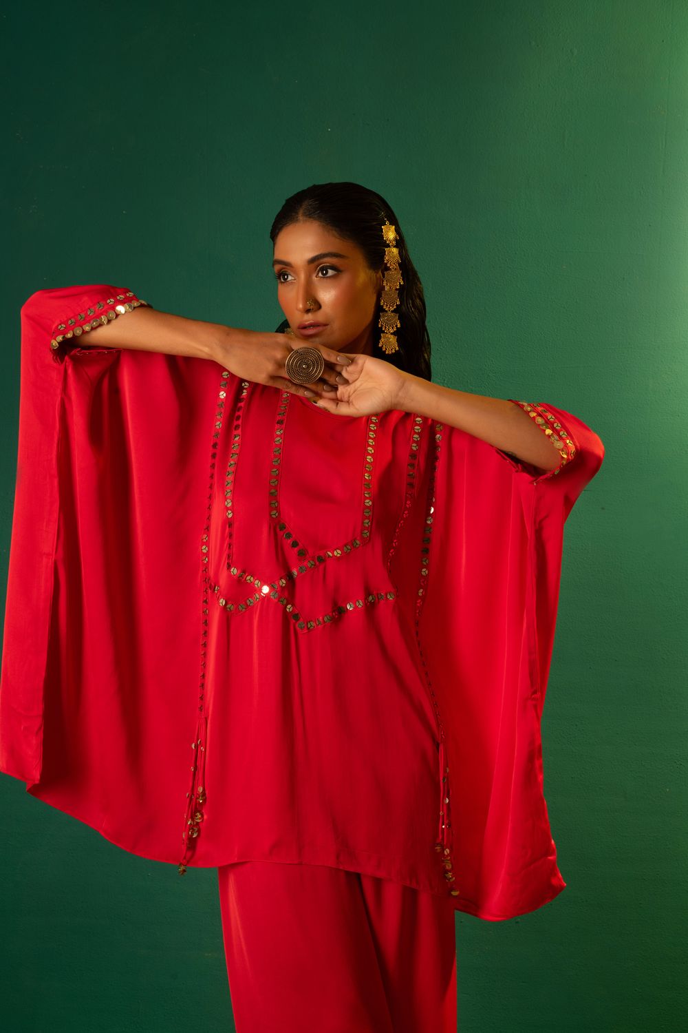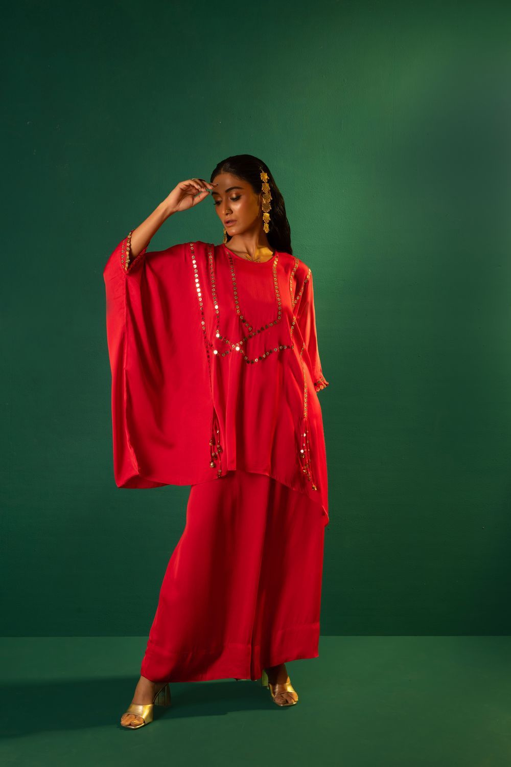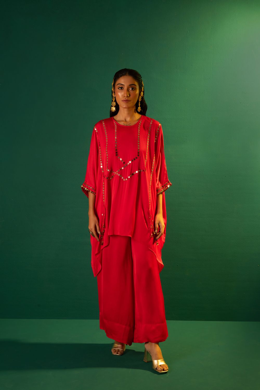 Inspired by traditional yemeni style this antifit tunic co-ord set is embellished with handembroidered lace in mirror like sequin in white gold. The set is completed with oversized pants