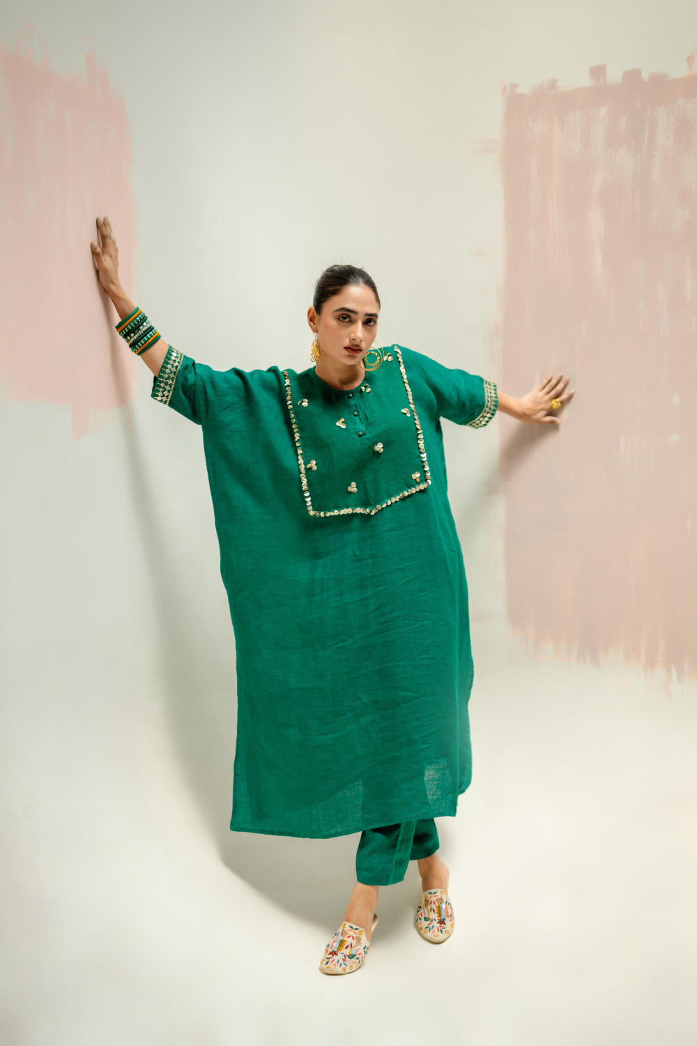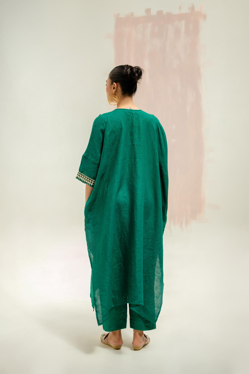 The pure linen longline kaftan kurta set has become a highly sought-after dress, known for its elegant design and comfort. The hand-embroidered yoke and wide sleeves add intricate detailing, while the slim linen pants provide a sleek, modern finish.
