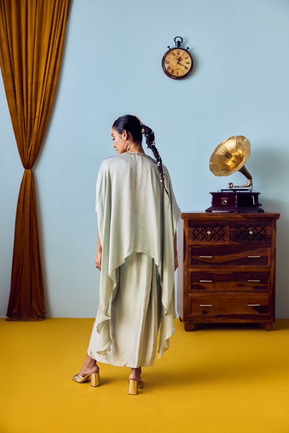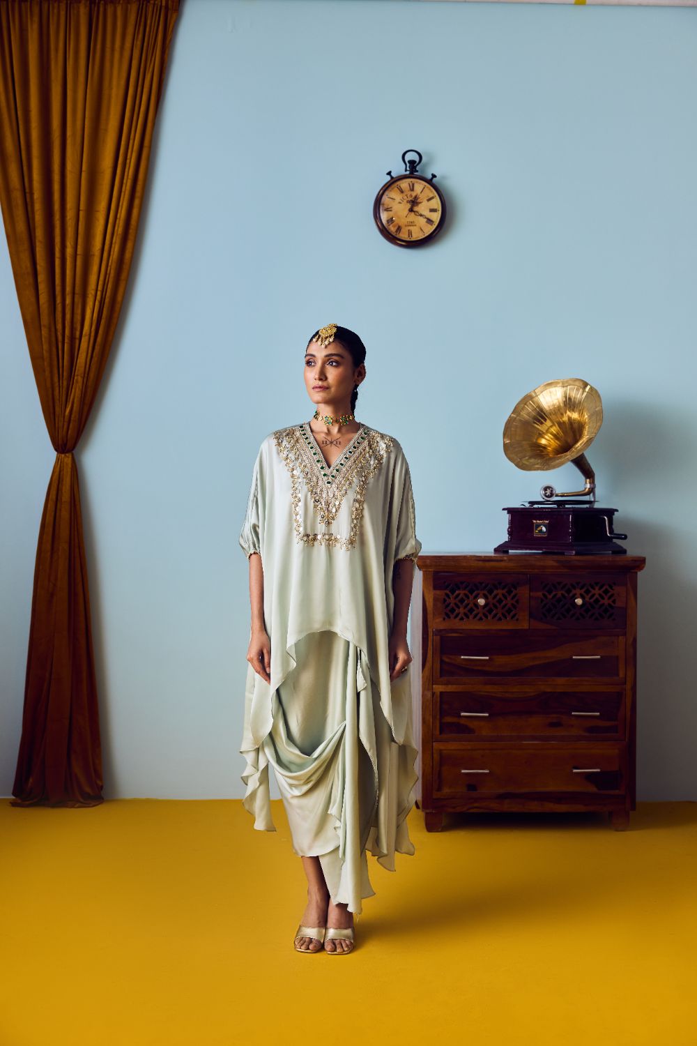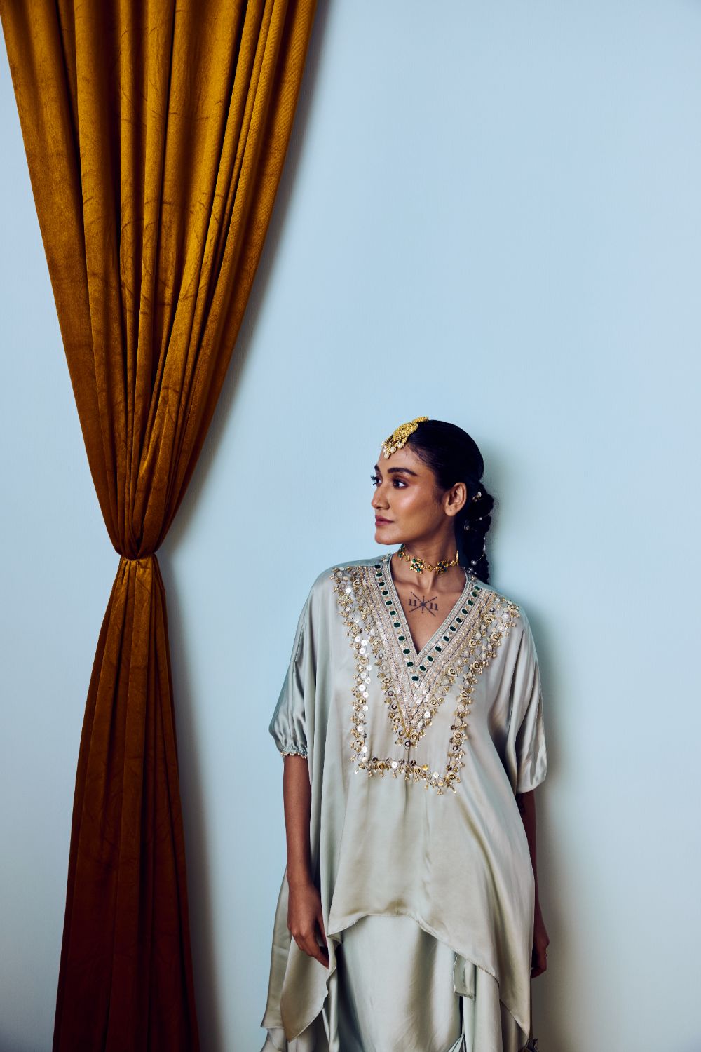 Featuring our signature anti-fit hi-low tunic with delicate hand embroidery .Paired with draped style skirt that are lined with soft muslin. The top is a free-fall silhouette flatters all body types,offering a relaxed yet refined look.Bottoms are true to fit yet flattering. Top width remains consistent across sizes S–XL and increases by 2" for 2XL–4XL. Model is wearing size S.Her body height is 5feet 5inches and wearing heels.