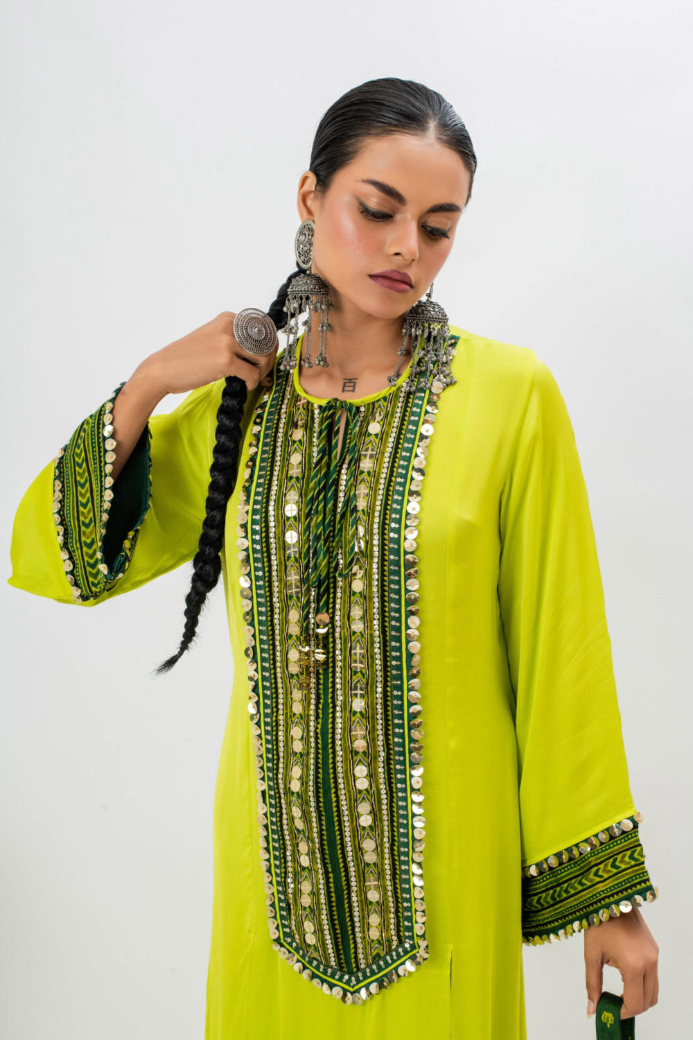 Long Kurta with hand embroidered ajrakh patch yoke in front & on pants with boho detailing