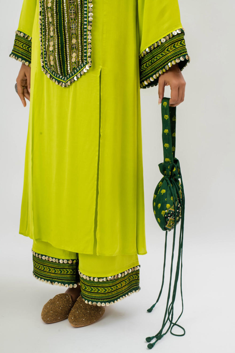 Preeti’s design philosophy is refreshingly modern: she takes silhouettes we know — the salwar set, the kurta, the lehenga-inspired skirt — and strips away the weight, quite literally. Fabrics rooted in heritage such as ajrakh and handwoven textiles become unexpectedly playful under her lens. A burst of neon here, a reworked motif there, a dash of embroidery that feels artisanal but never ornate.