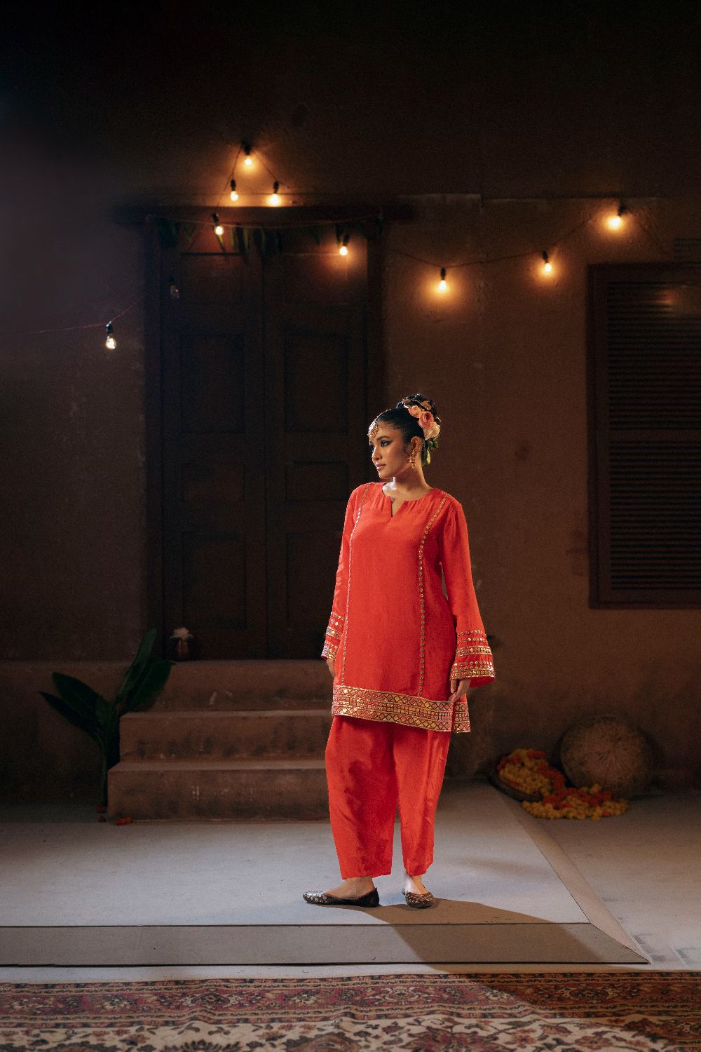Elevate your festive wardrobe with this wardrobe must have simple Salwar Kameez Kurta set featuring vegan leather appliqué in a light gold, gota-inspired design. The kurta offers a relaxed, elegant fit,making it perfect for pre-weddings & trousseau, festive occasions, and wedding celebrations. Model wears size S.