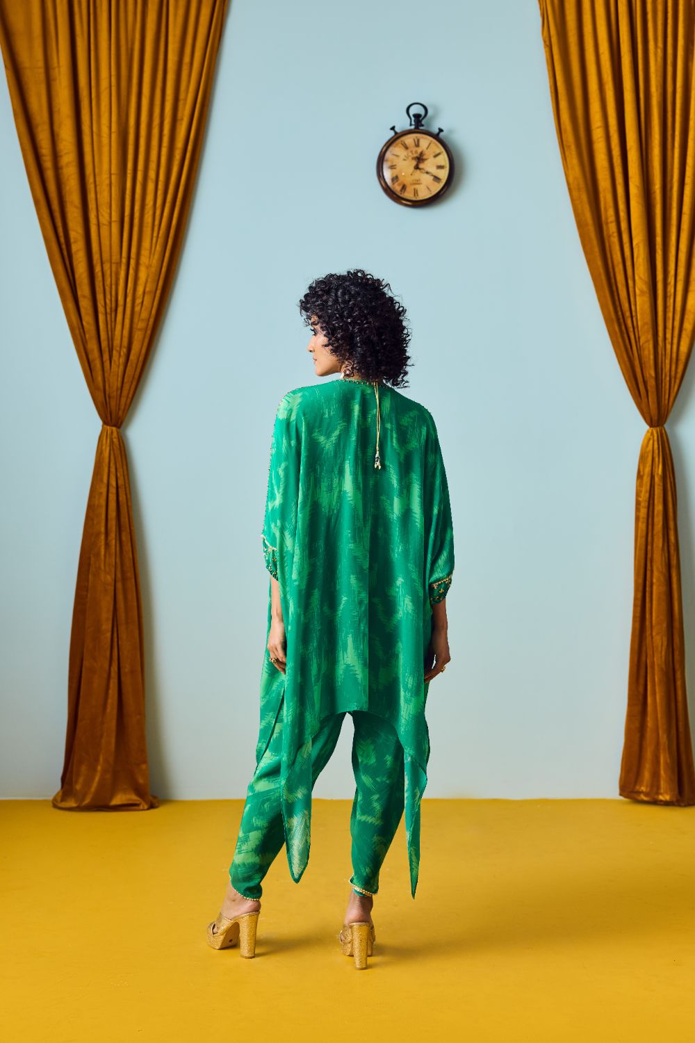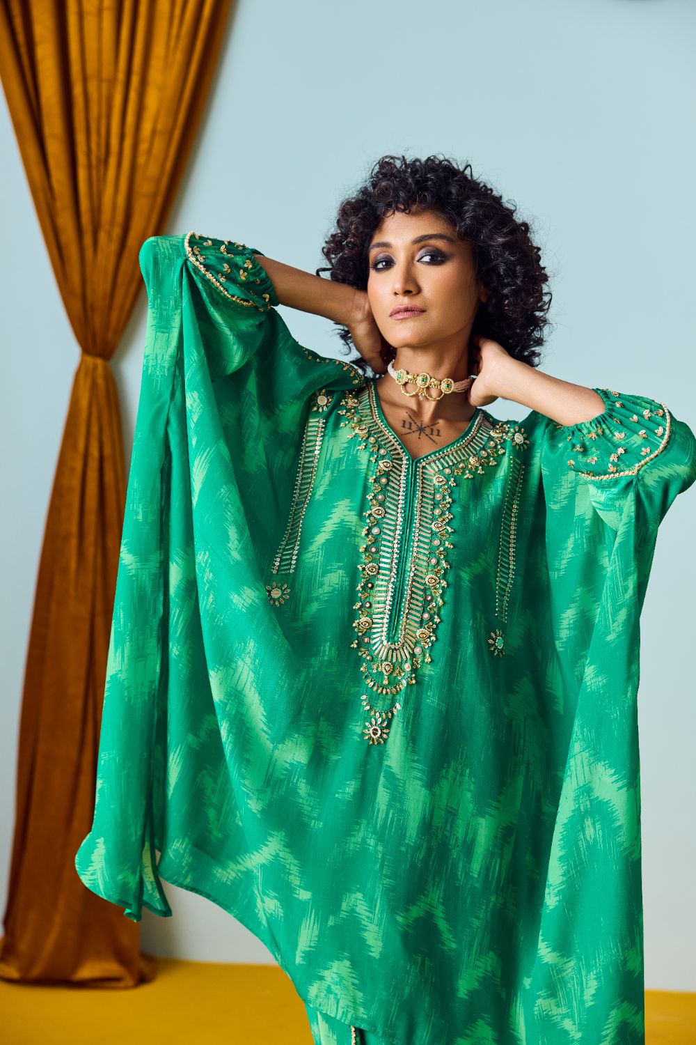 Featuring an antifit hand-embroidered kaftan tunic paired with tulip pants. The kaftan tunic has a relaxed, flowing fit with the model shown wearing size S. The bottom consists of tulip-style pants with reinforced seams and decorative handmade pearl gota lace trim along the edges. While the top offers a loose, comfortable fit, the tulip pants are designed to fit and are true to size.