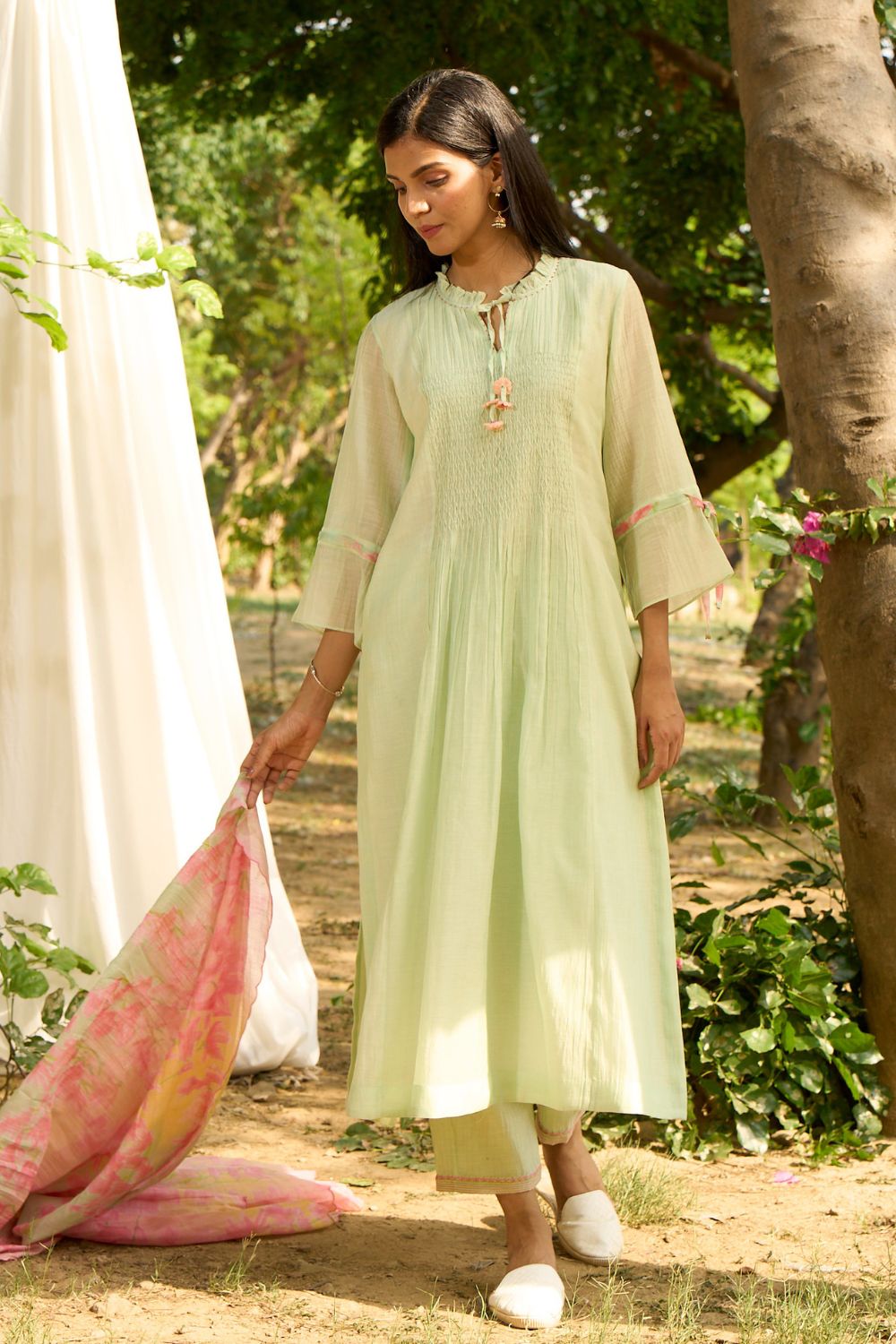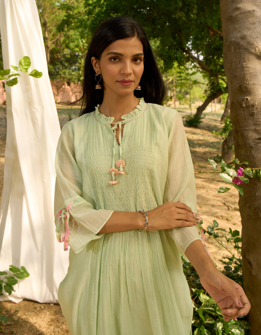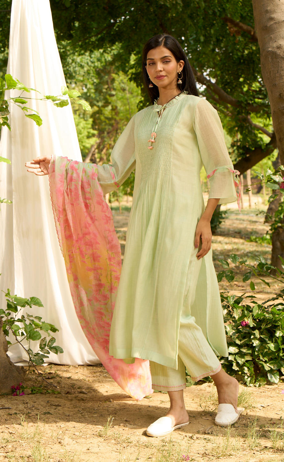 Light Green kurta pant set with intricate smocking details, a relaxed fit and flowing sleeves. Printed smart tie-up on sleeves with floral ties around the frill edged neckline. Beautiful floral printed dupatta and embroidered pant.
