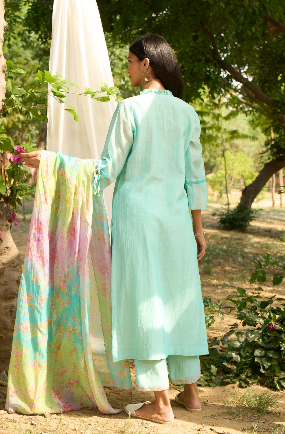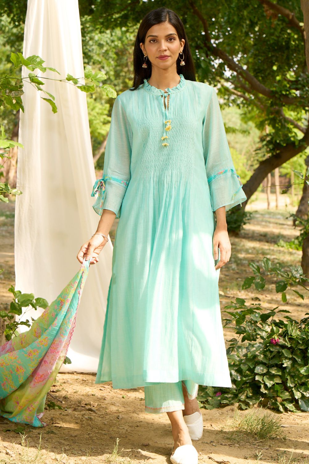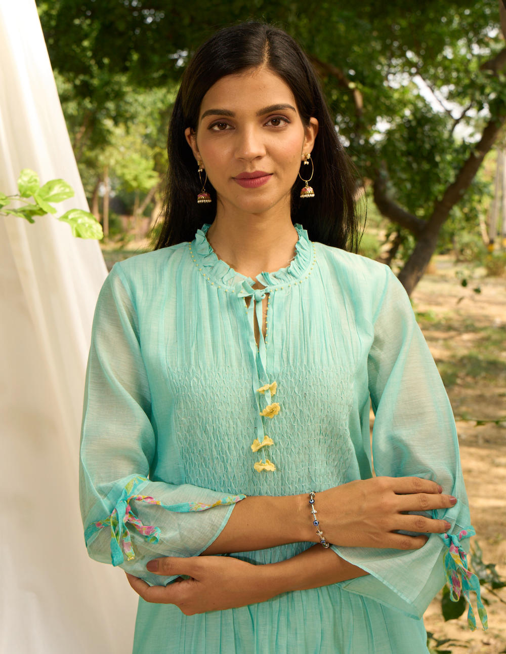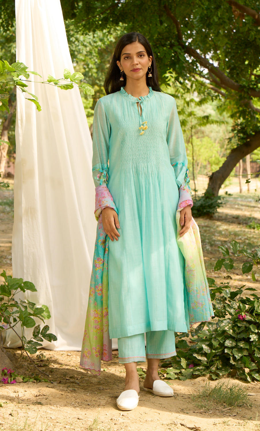 Turquoise kurta pant set with intricate smocking details, a relaxed fit and flowing sleeves. Printed smart tie-up on sleeves with floral ties around the frill edged neckline. Beautiful floral printed dupatta and embroidered pant.