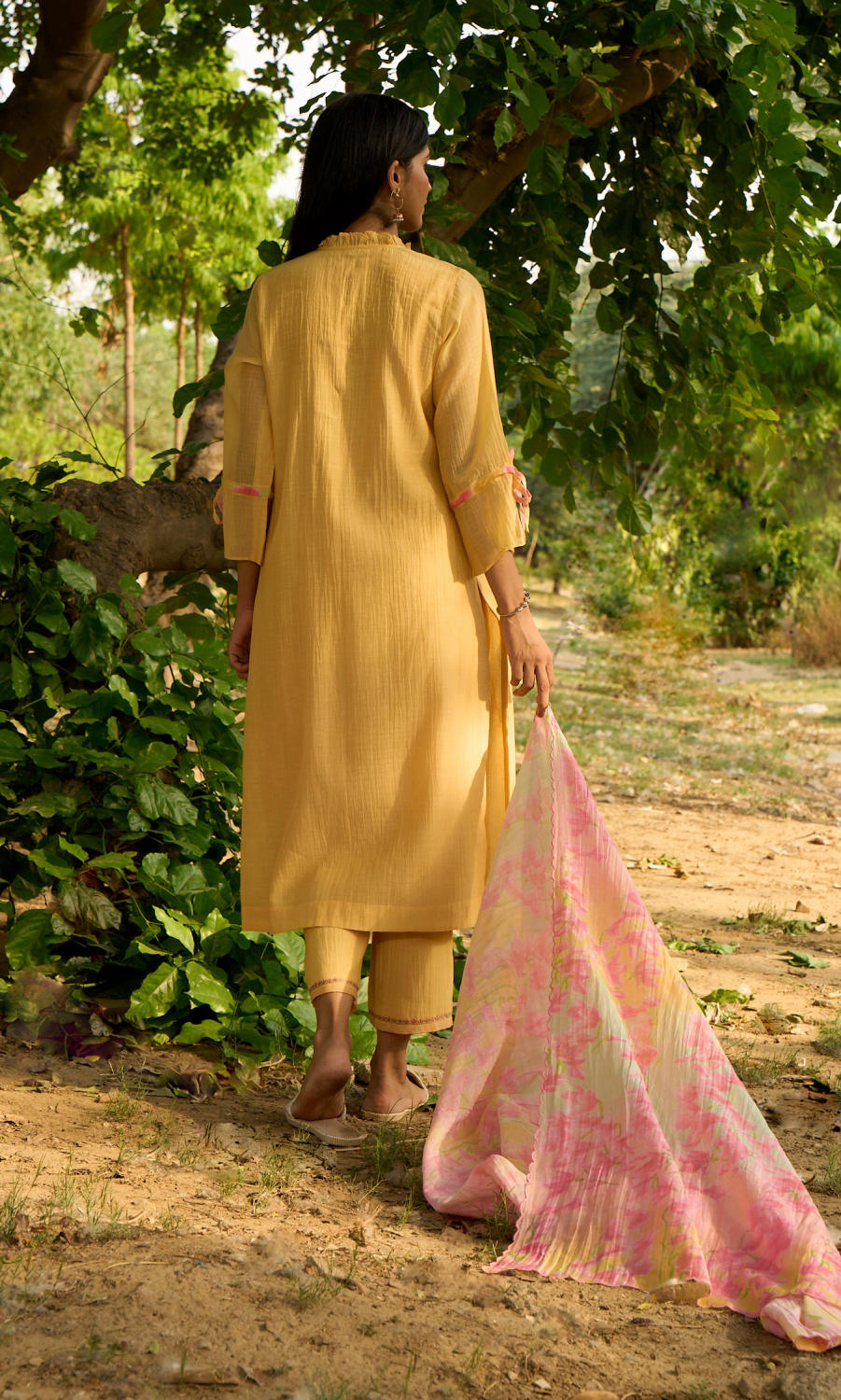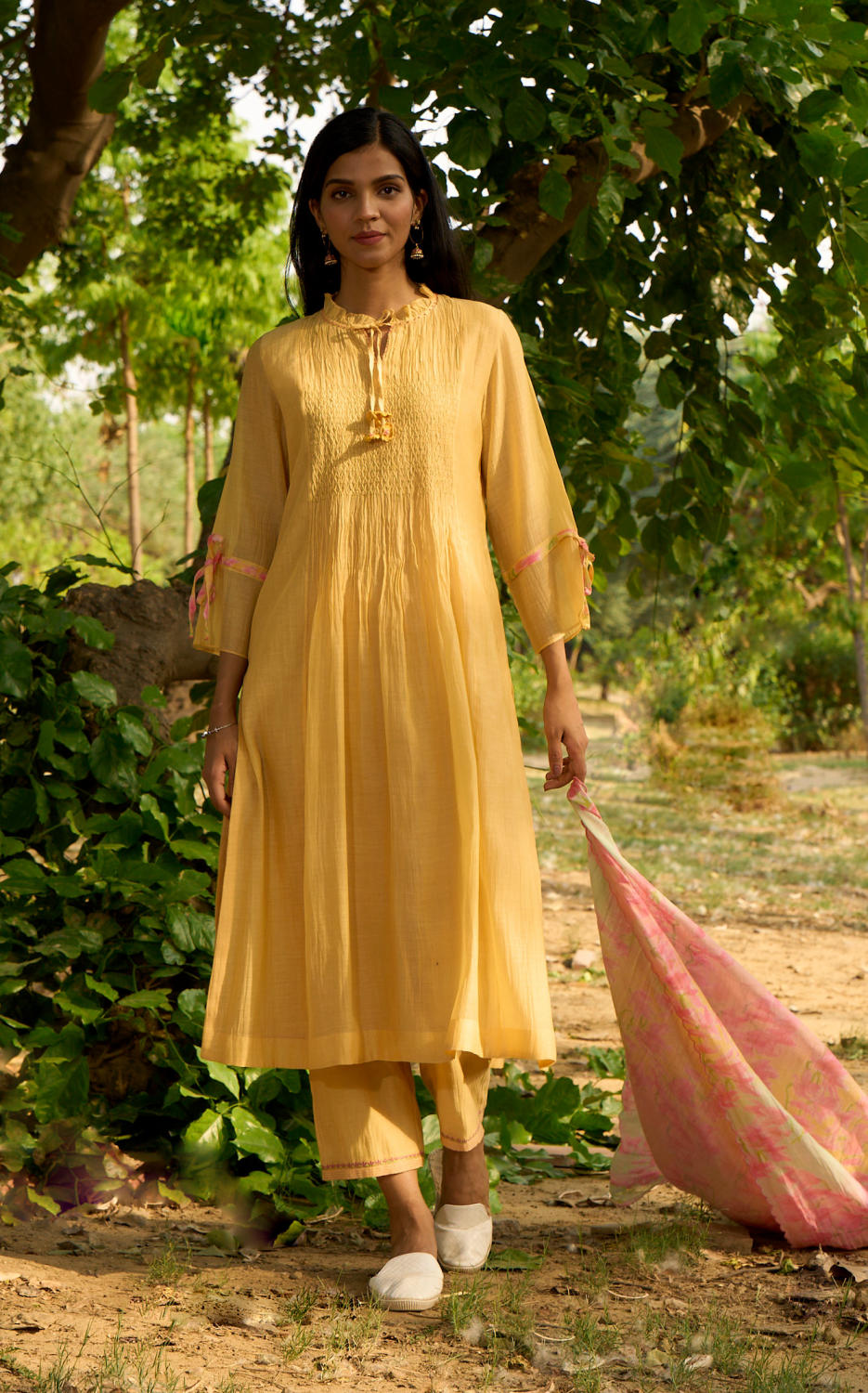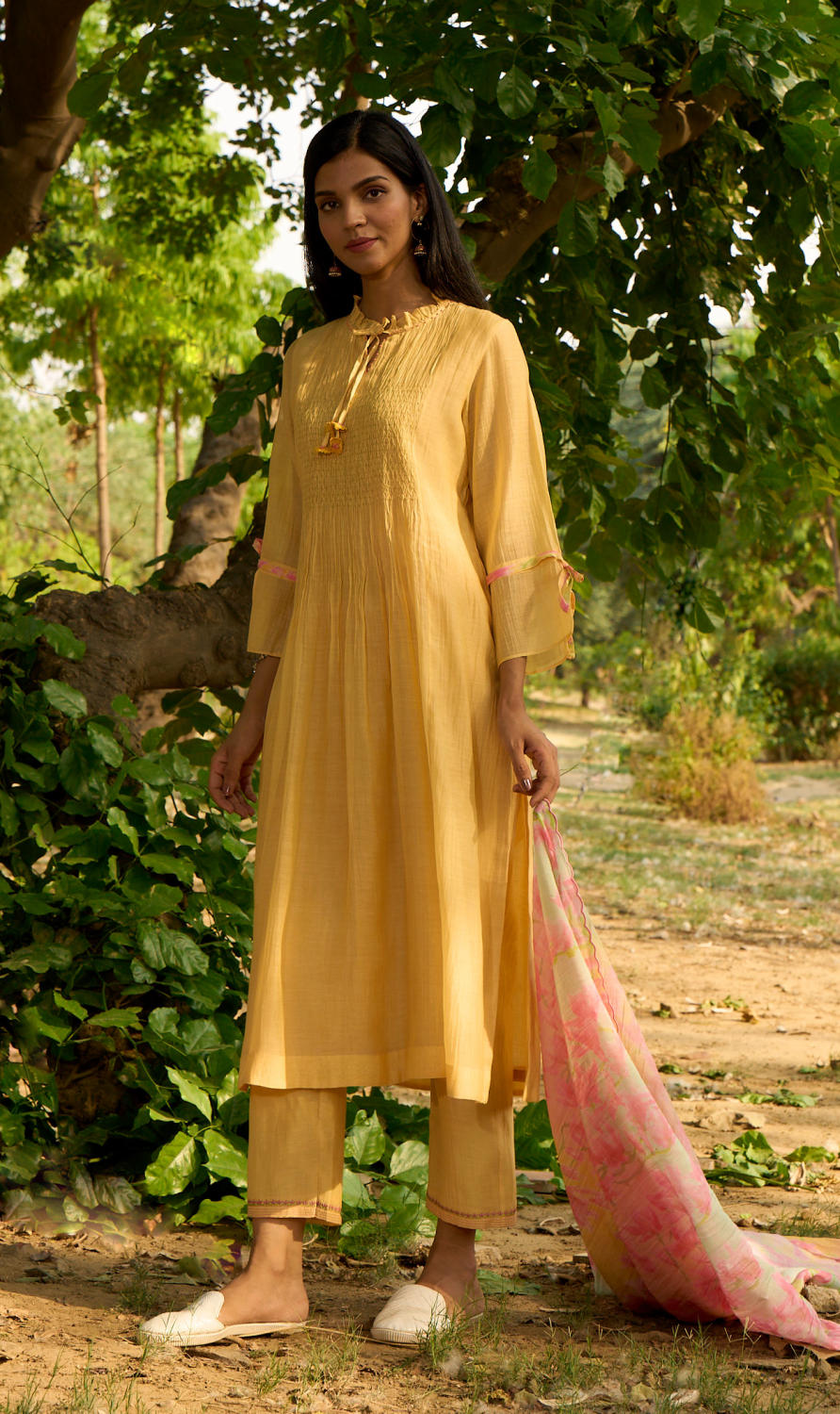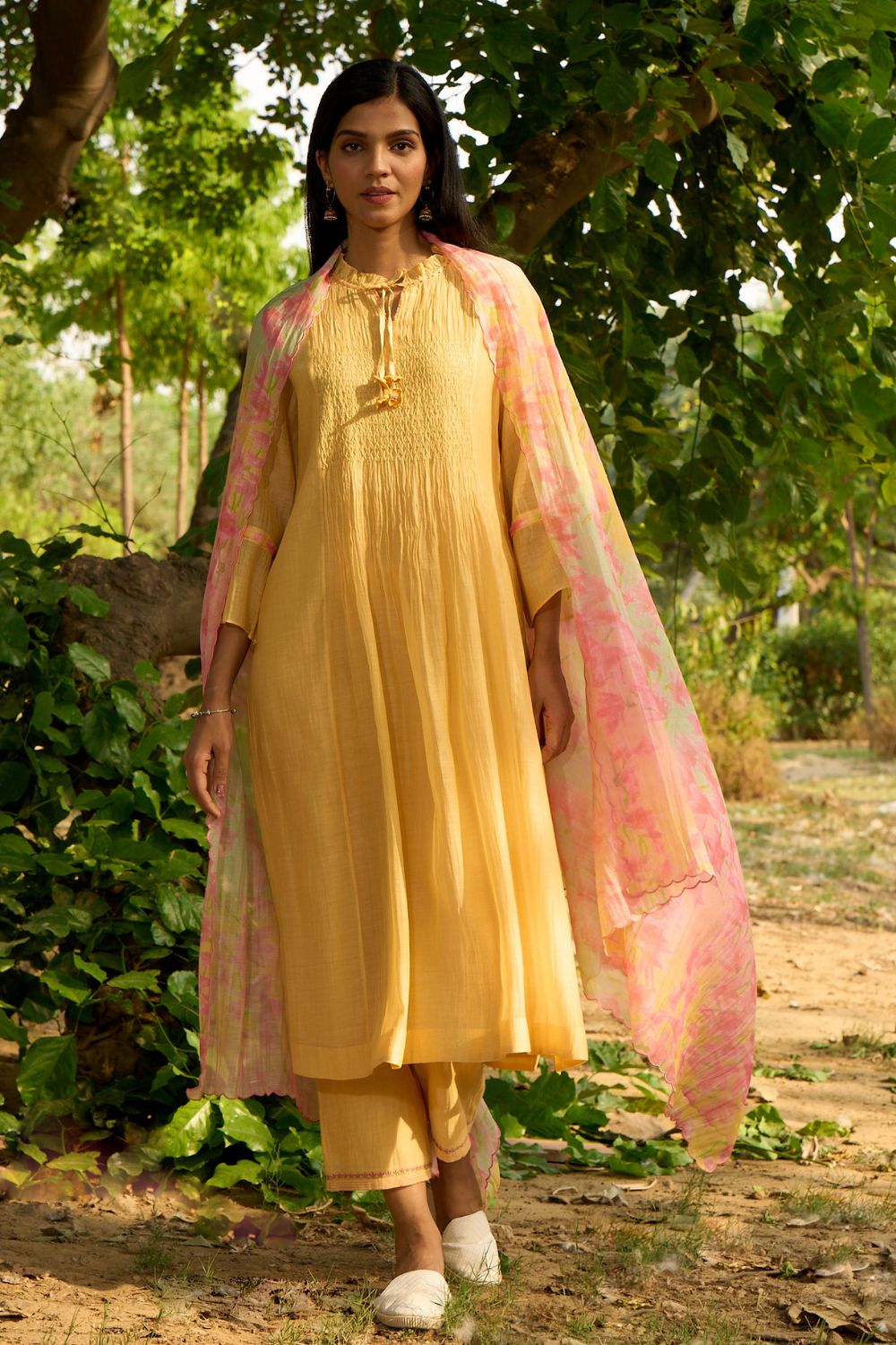 Yellow kurta pant set with intricate smocking details, a relaxed fit and flowing sleeves. Printed smart tie-up on sleeves with floral ties around the frill edged neckline. Beautiful floral printed dupatta and embroidered pant.
