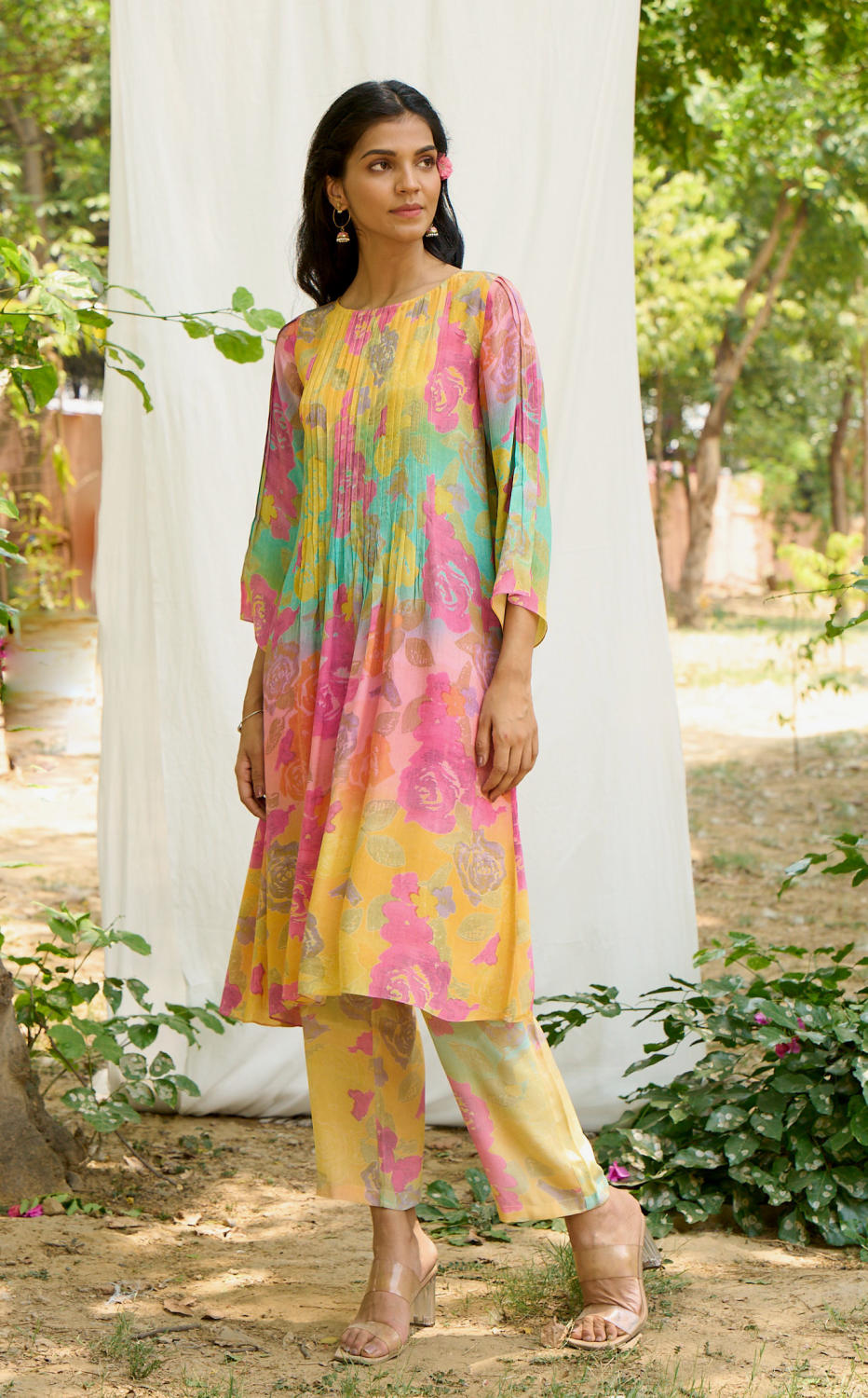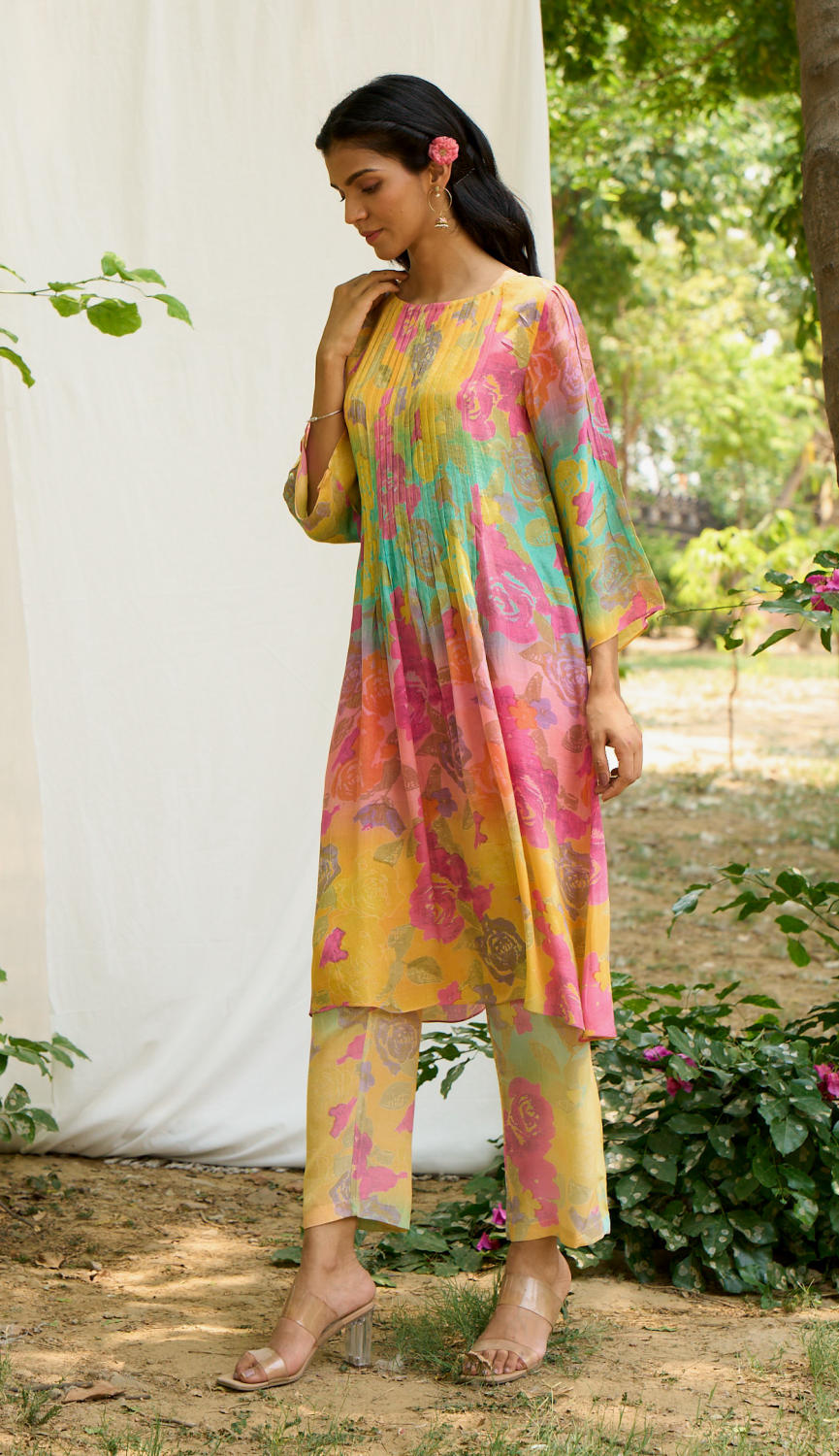 Pleated kurta with floral prints and Printed Pant