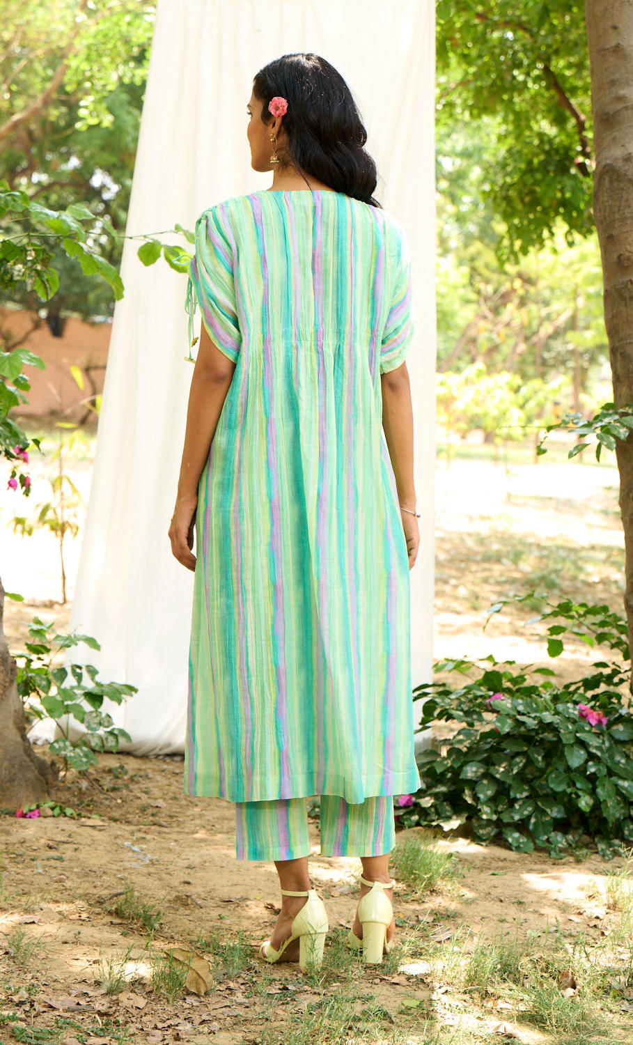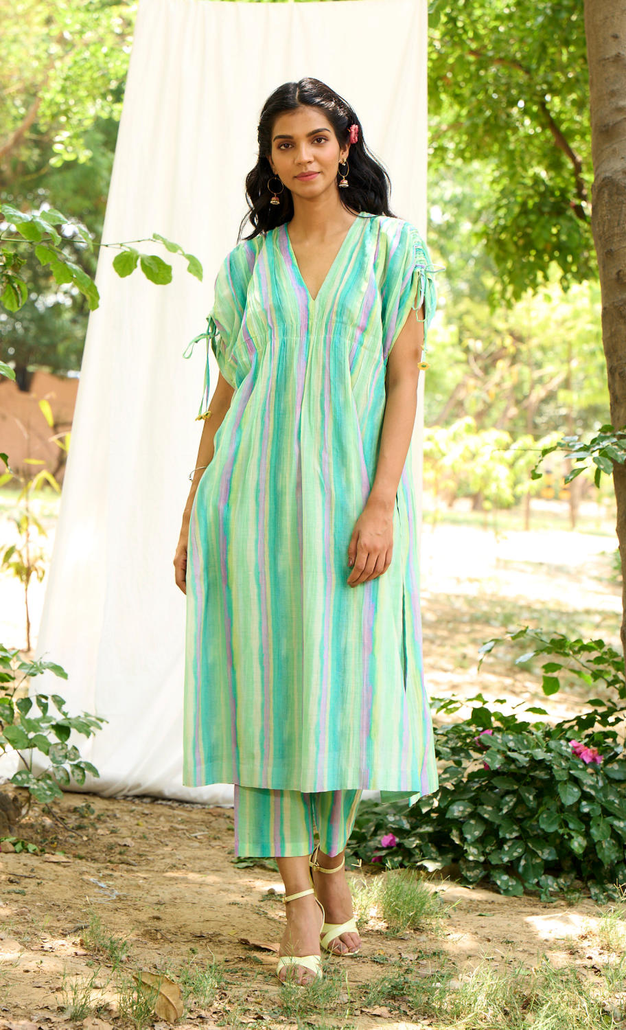 Kaftan look stripe kurta set with lovely play of colours and ruched up sleeves with floral ties and Strip Pant