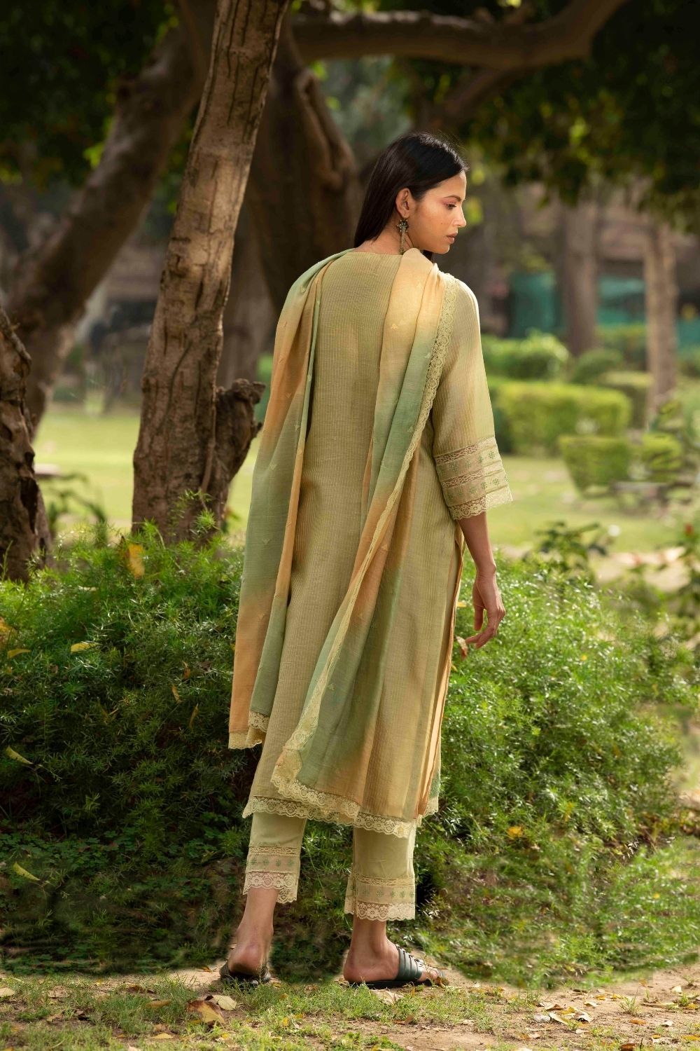Green bead work and Lace Kurta and pants , with woven buti shaded mal dupatta