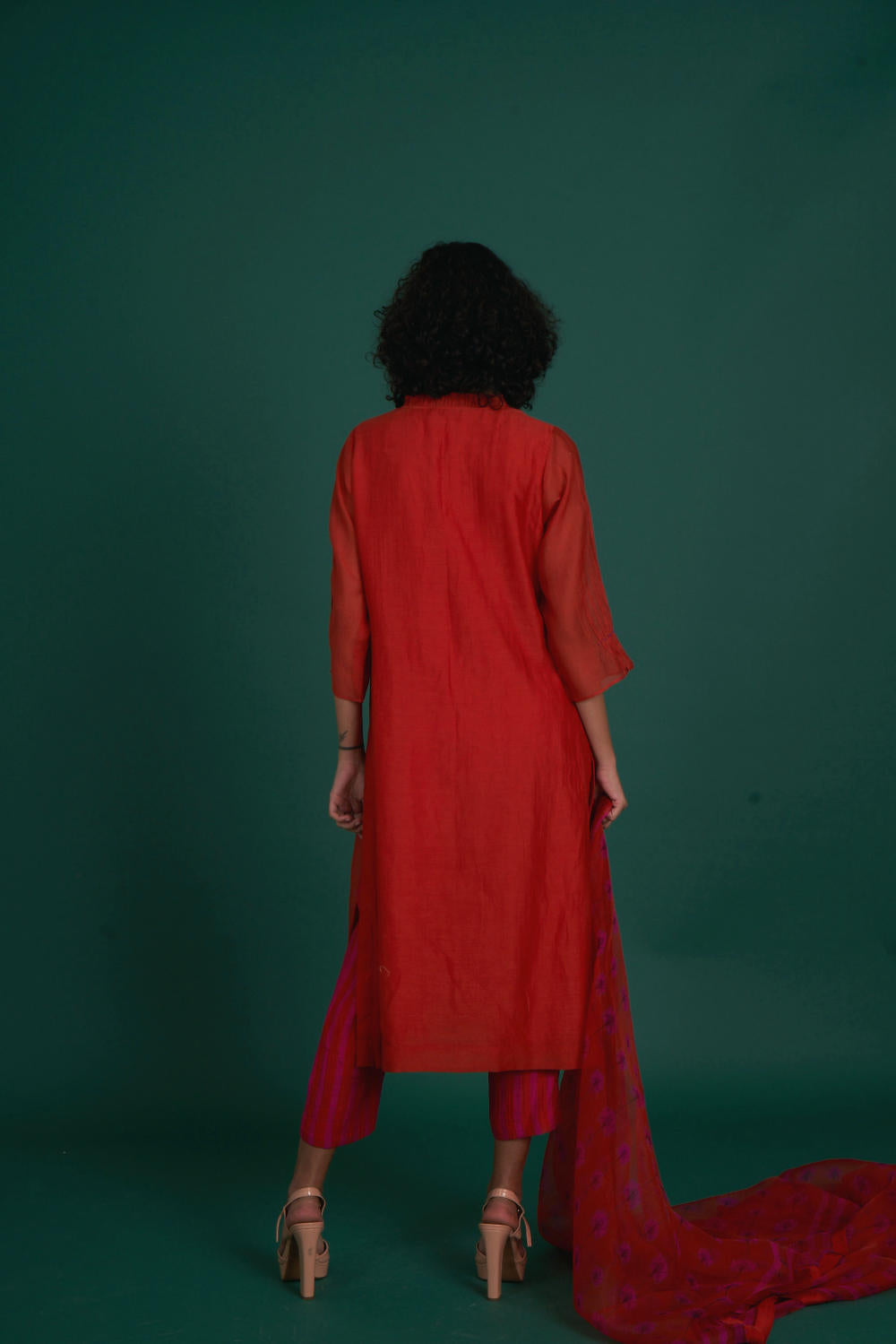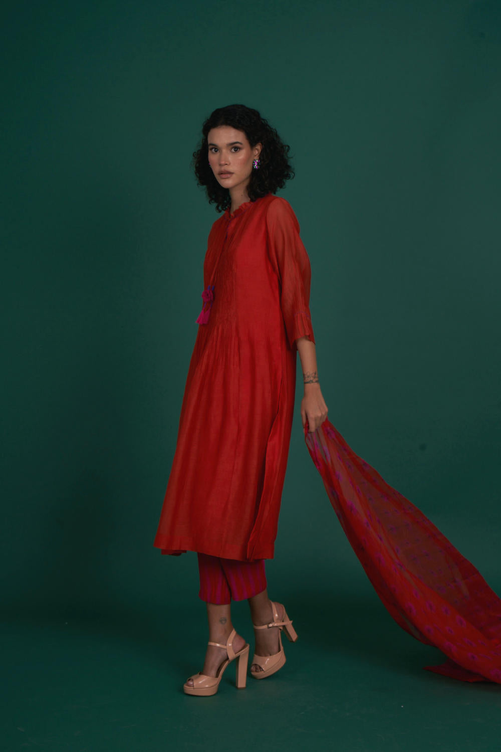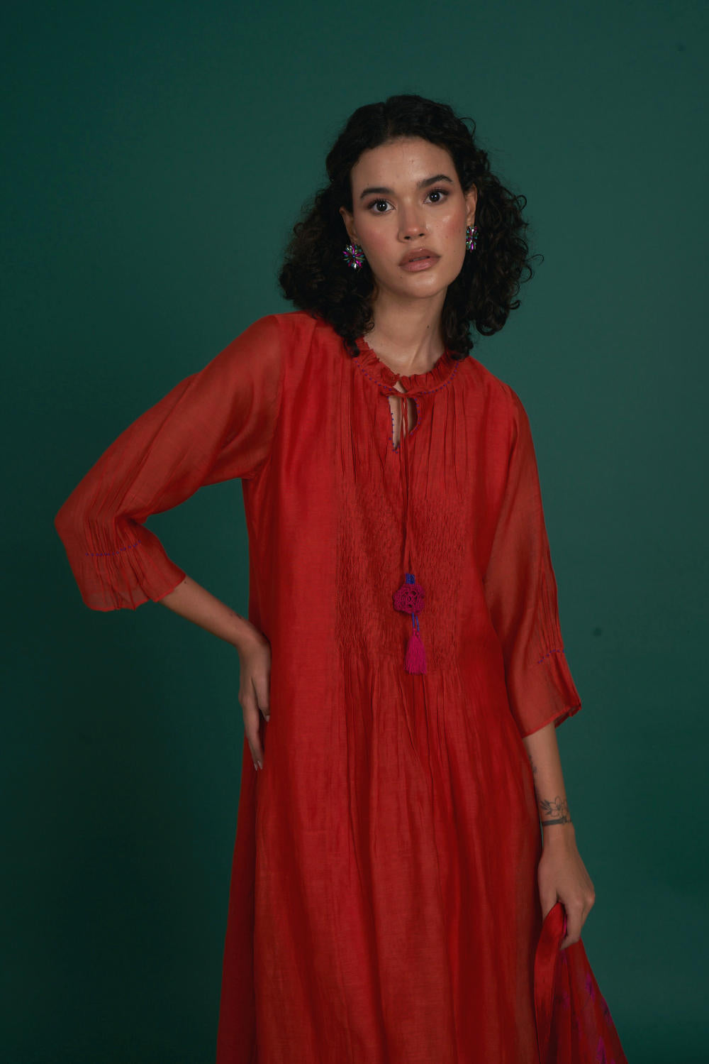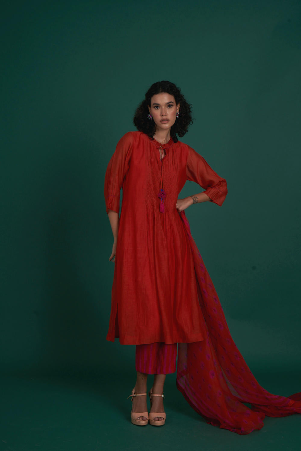 Intricate smocking, beadwork and crochet detailing are on this kurta set . A very festive silk organza dupatta in our signature print makes the outfit great pick
