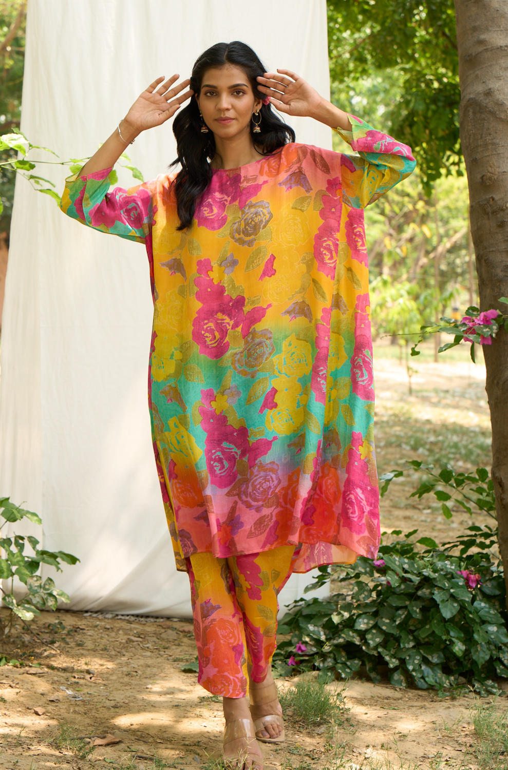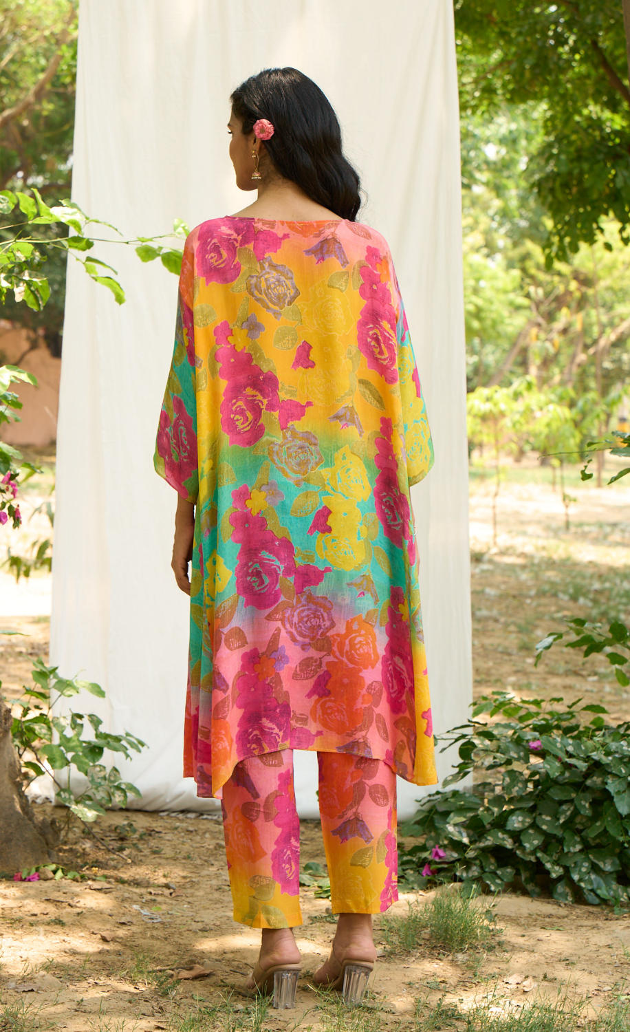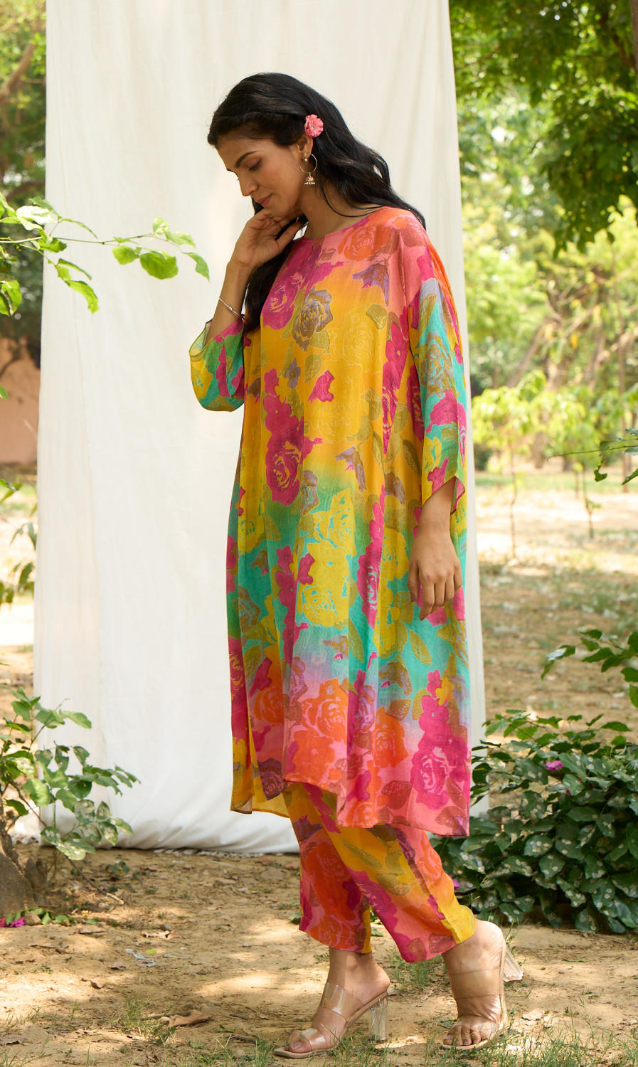 Kaftan look Kurta with beautiful floral prints and floral print pant.