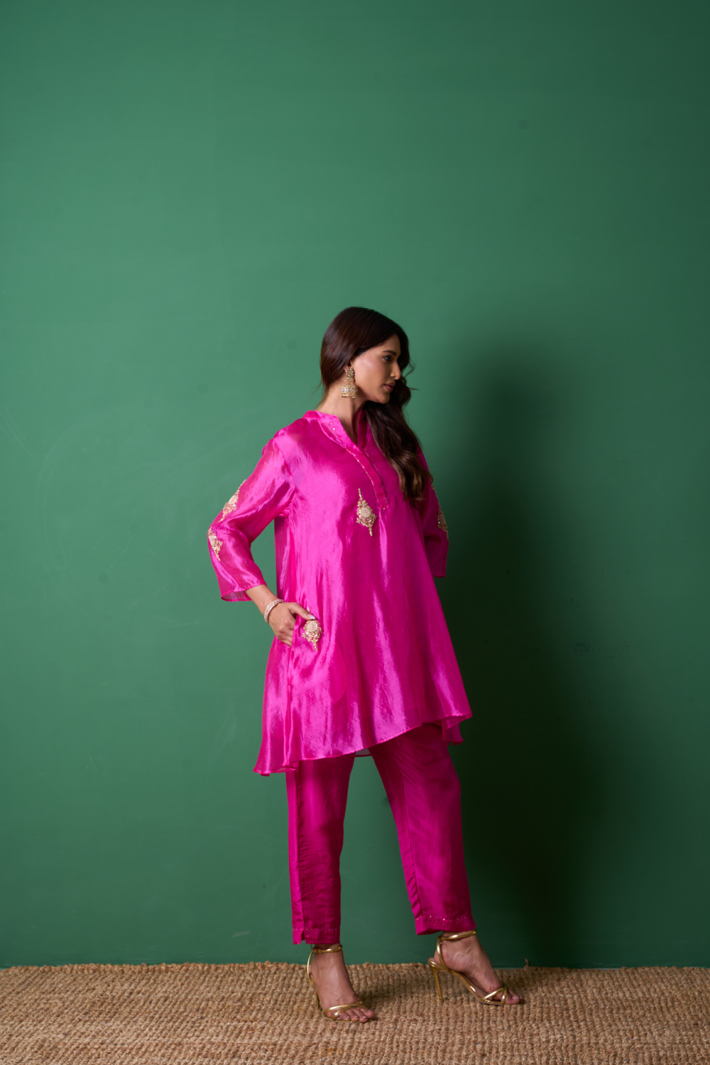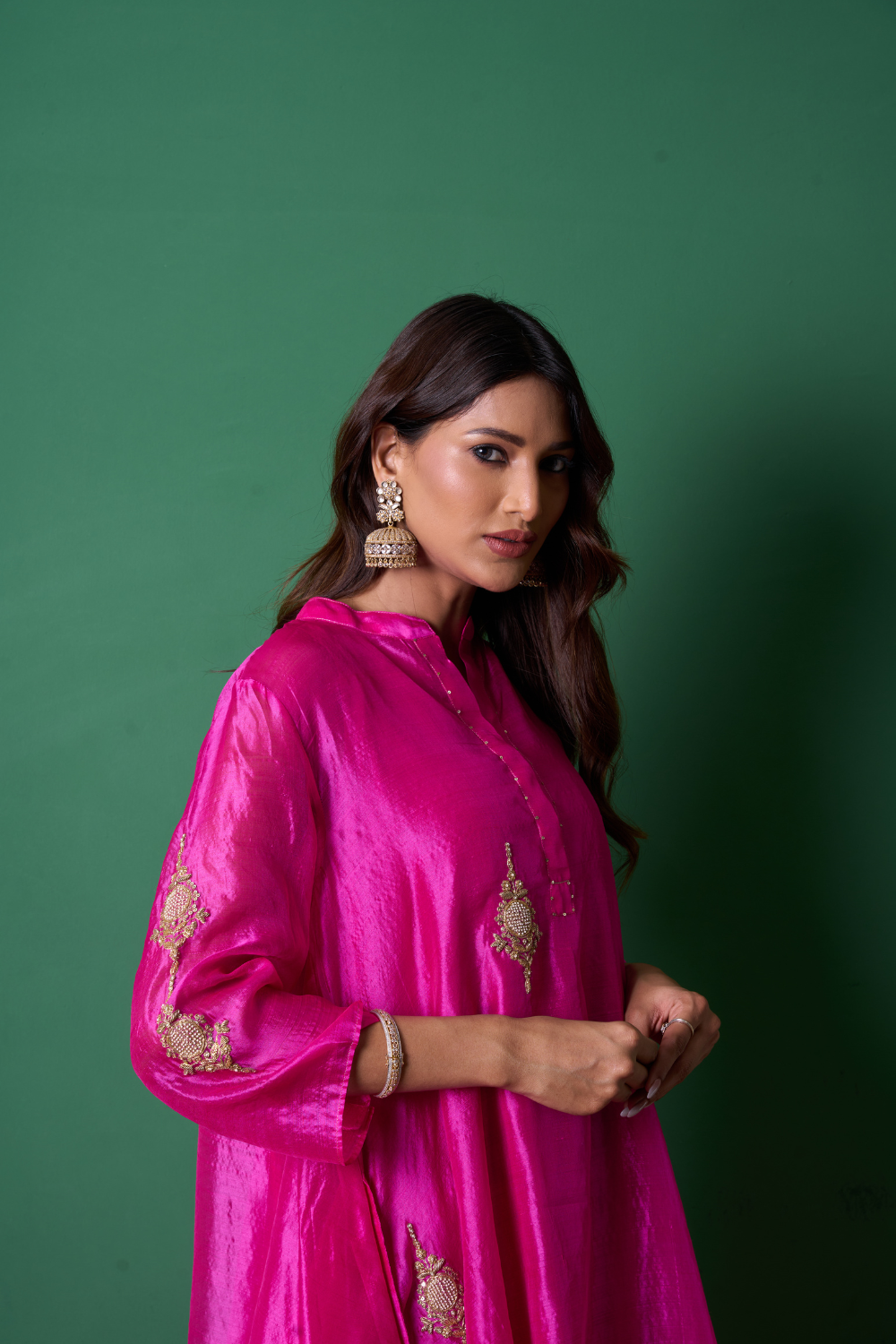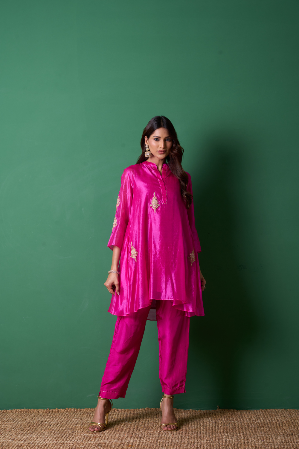 Cord Styled relaxed fit Top and pants with delicate zardozi and bead work on front , back and Sleeves. Embroidered Pants and Organza dupatta with golden border.