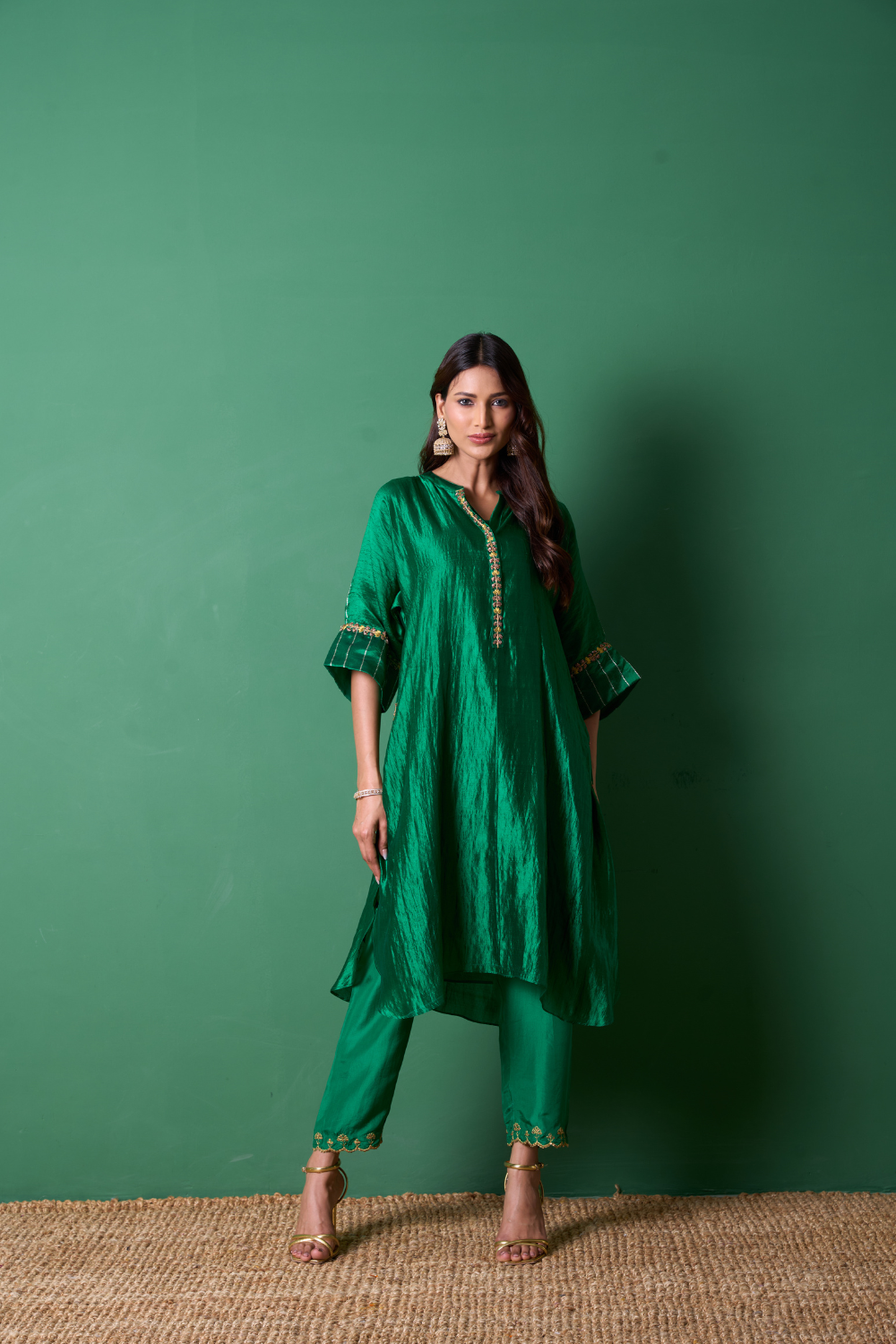 Kaftan styled kurta pant set with intricate zardozi details, Silver stripes on back panel, pockets, a relaxed fit with flowing sleeves and embroidered pants.