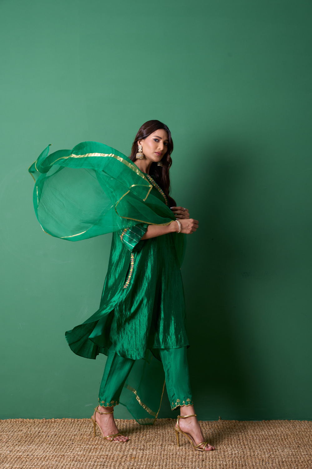 Kaftan styled kurta pant set with intricate zardozi details, Silver stripes on back panel, pockets, a relaxed fit with flowing sleeves with embroidered pants. Organza dupatta with golden border.
