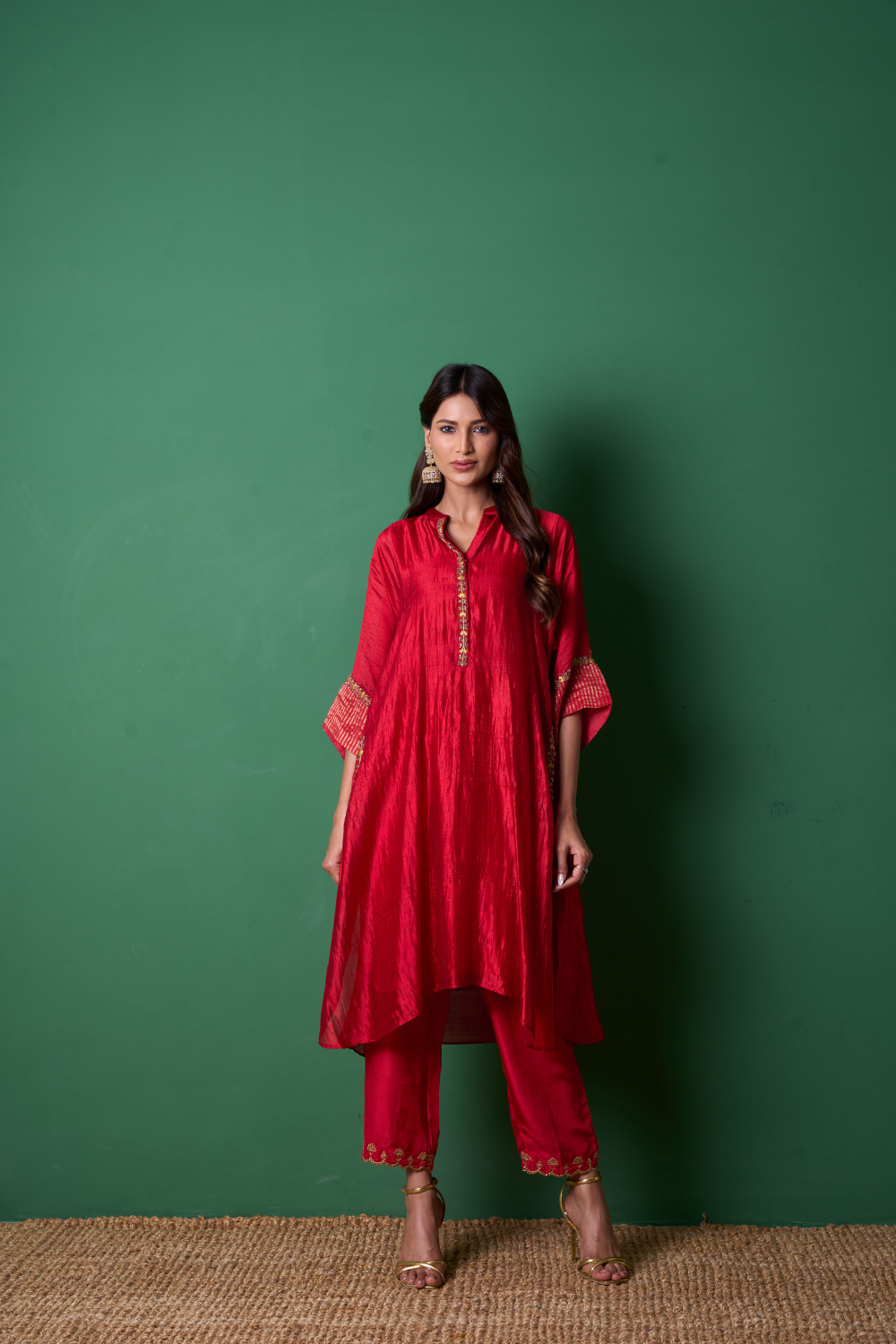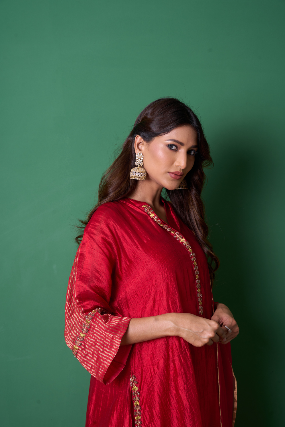 Kaftan styled kurta pant set with intricate zardozi details, Golden stripes on back panel, pockets, a relaxed fit with flowing sleeves with embroidered pants. Organza dupatta with golden border.