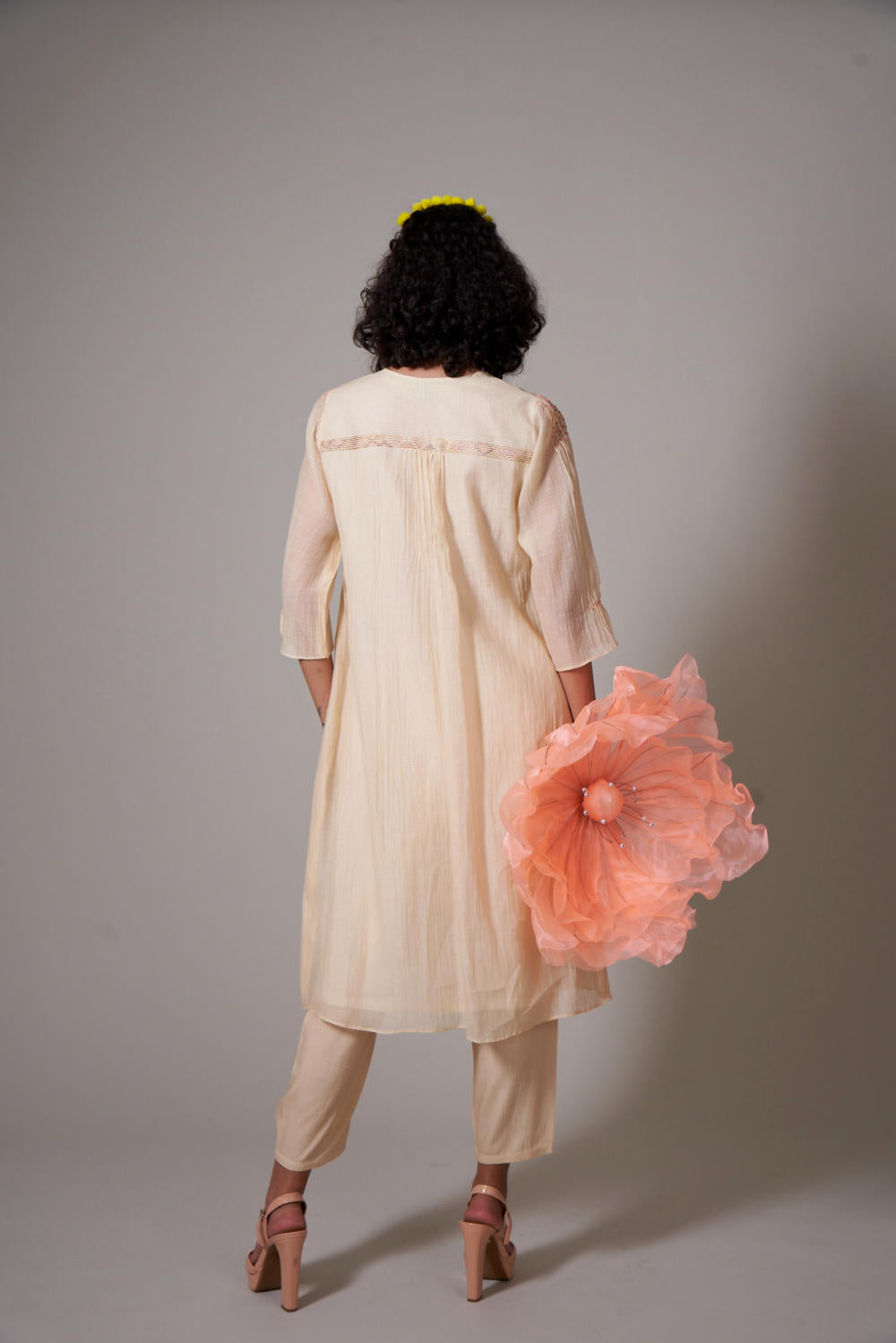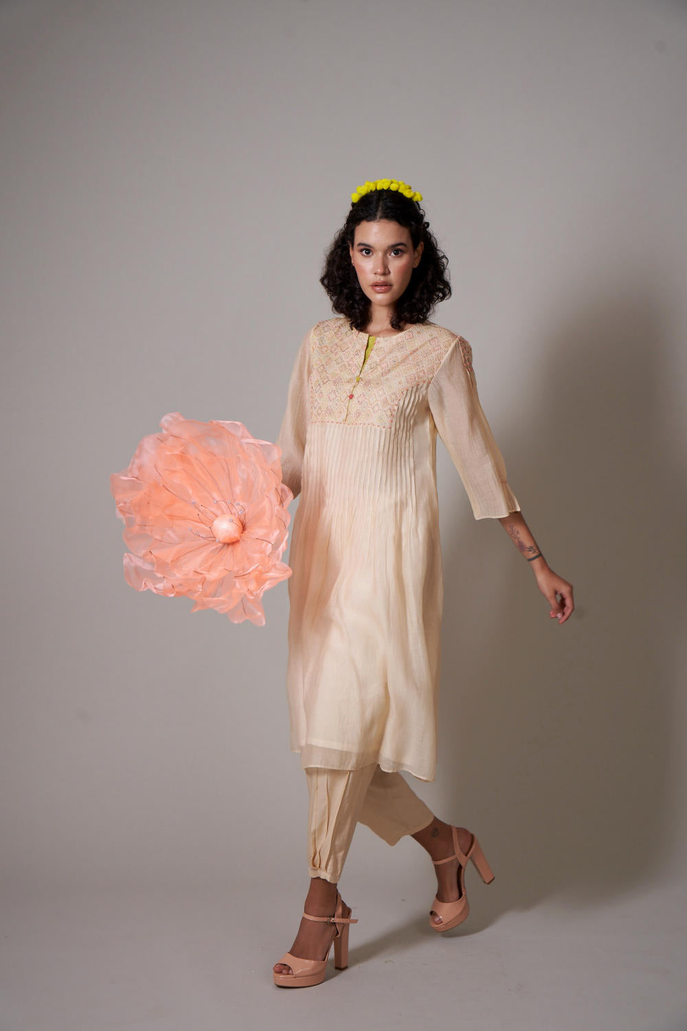 Handwoven mul cotton silk in sepia colour, comfort fit pleated dress with embroidered yoke adorn with bead work, colourful buttons and paired with side pleated sepia pant.