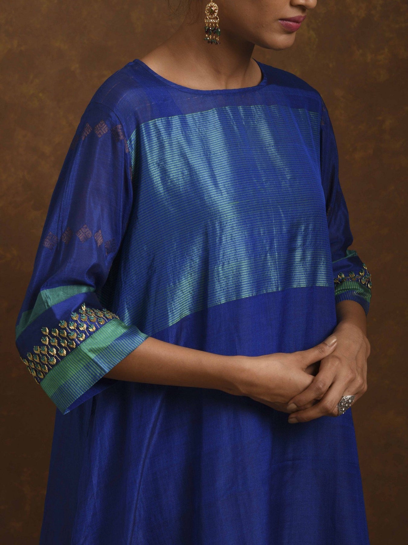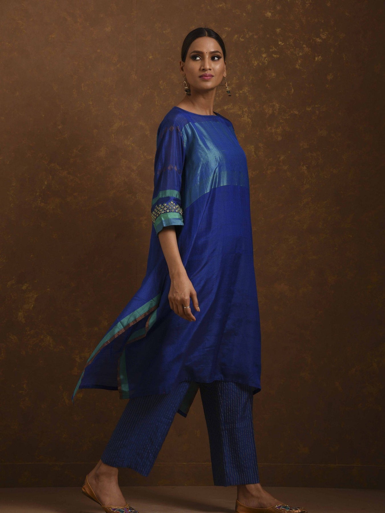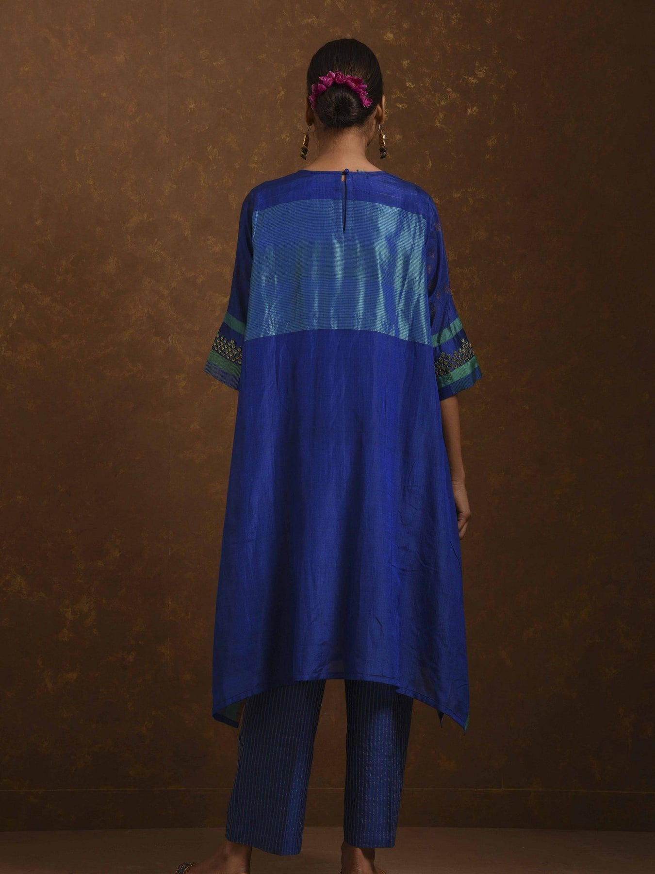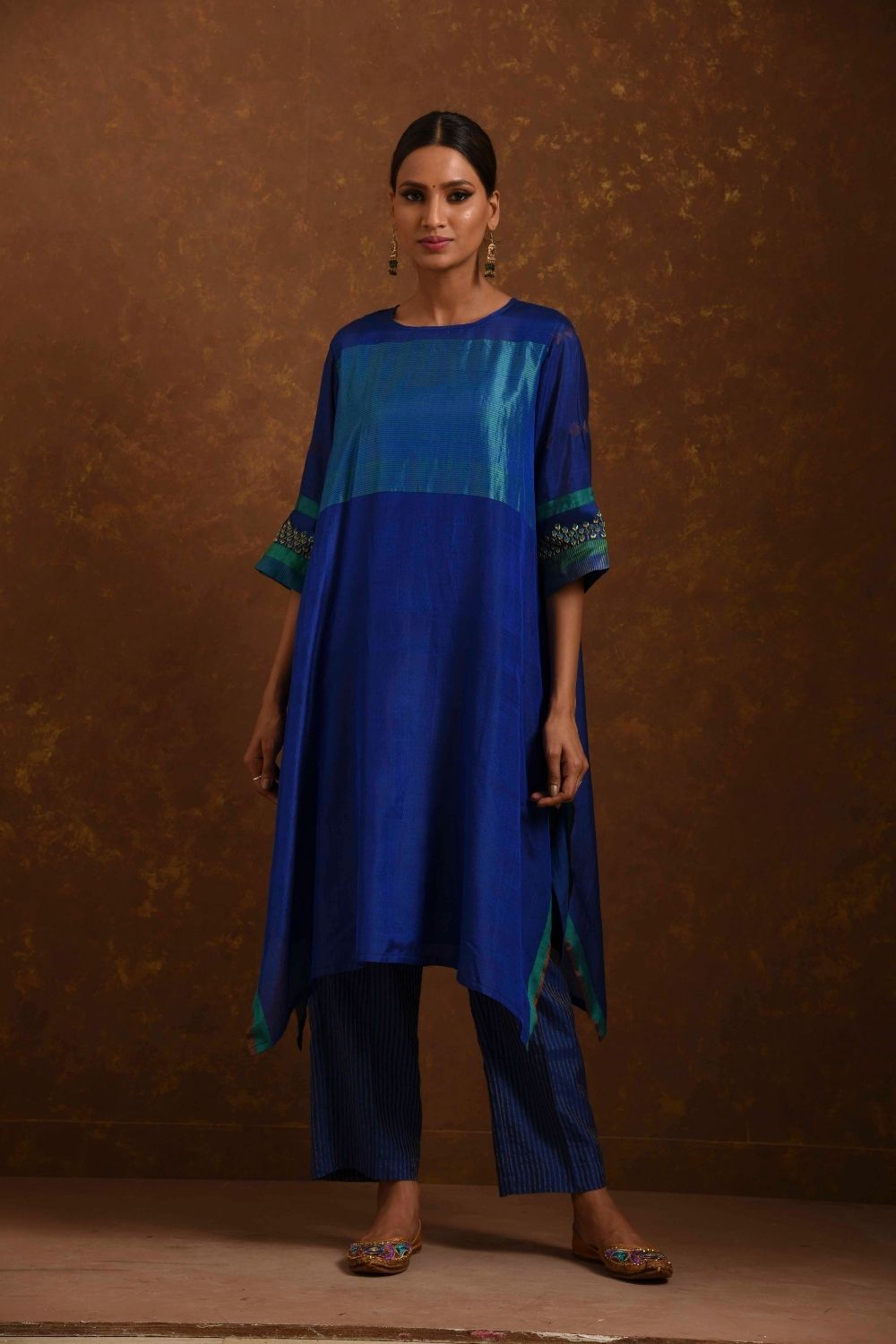 Asymmetric Kurta with stripe yoke, Mashroo farsi pants, zardozi handwork