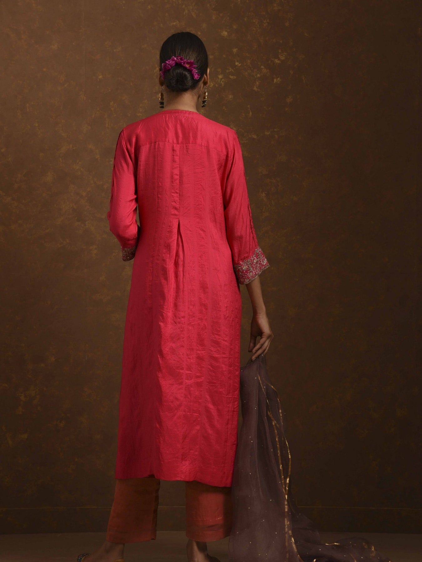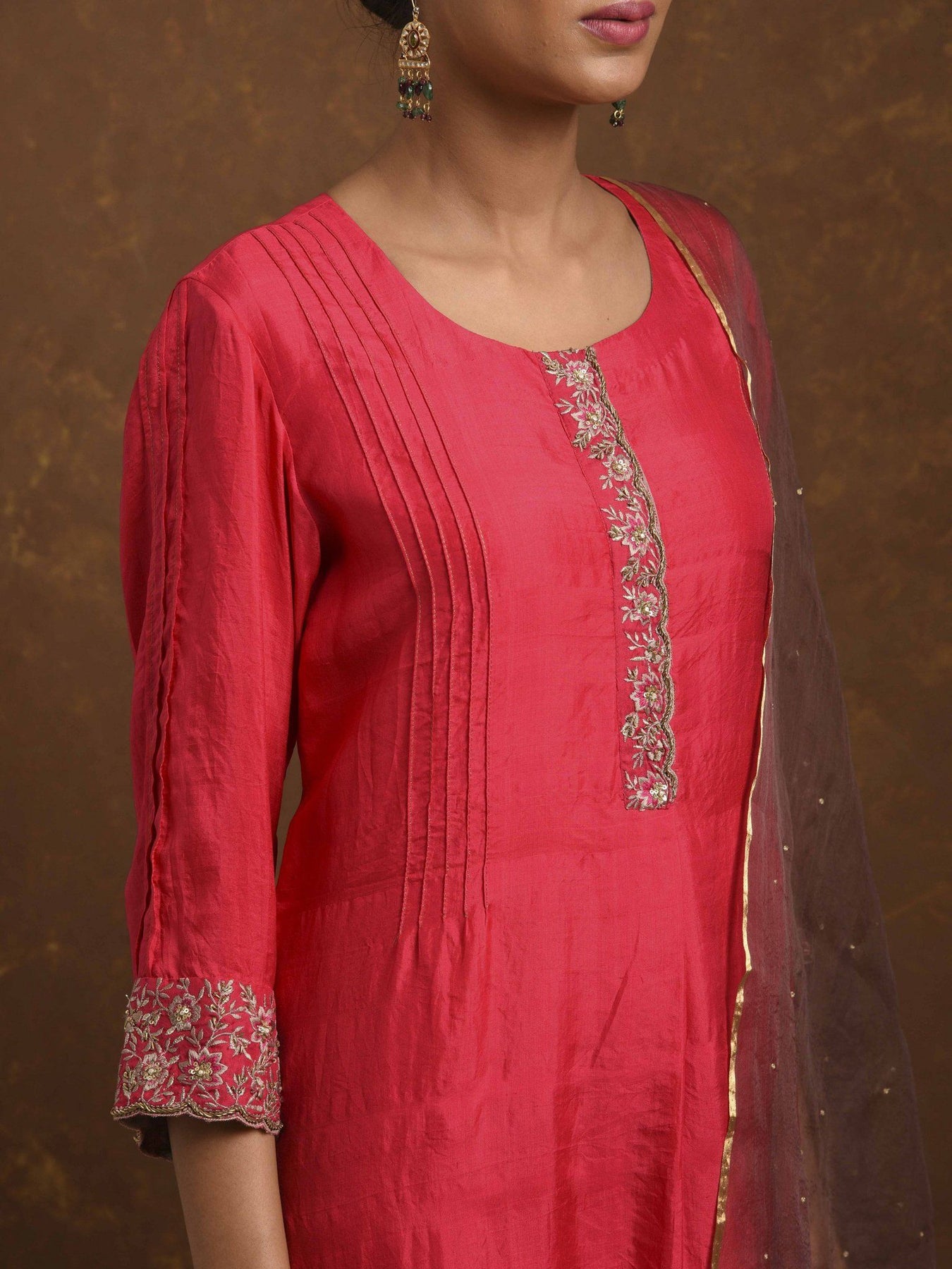 Straight fit kurta with embroidery placket and sleeve, dupatta, tissue narrow pants, zardozi handwork