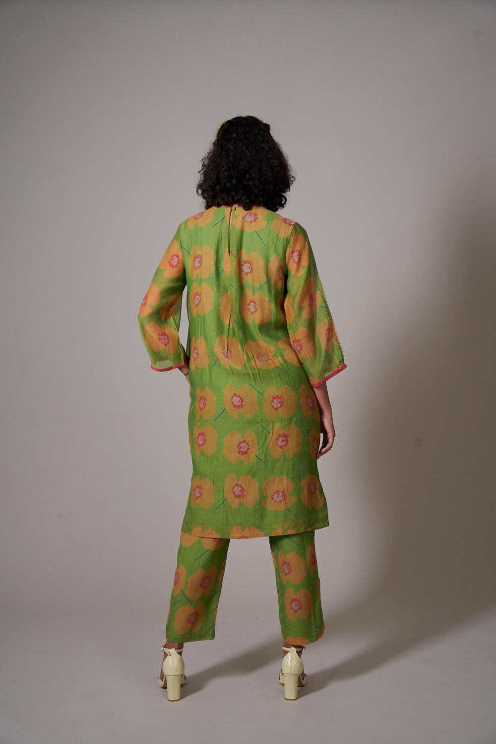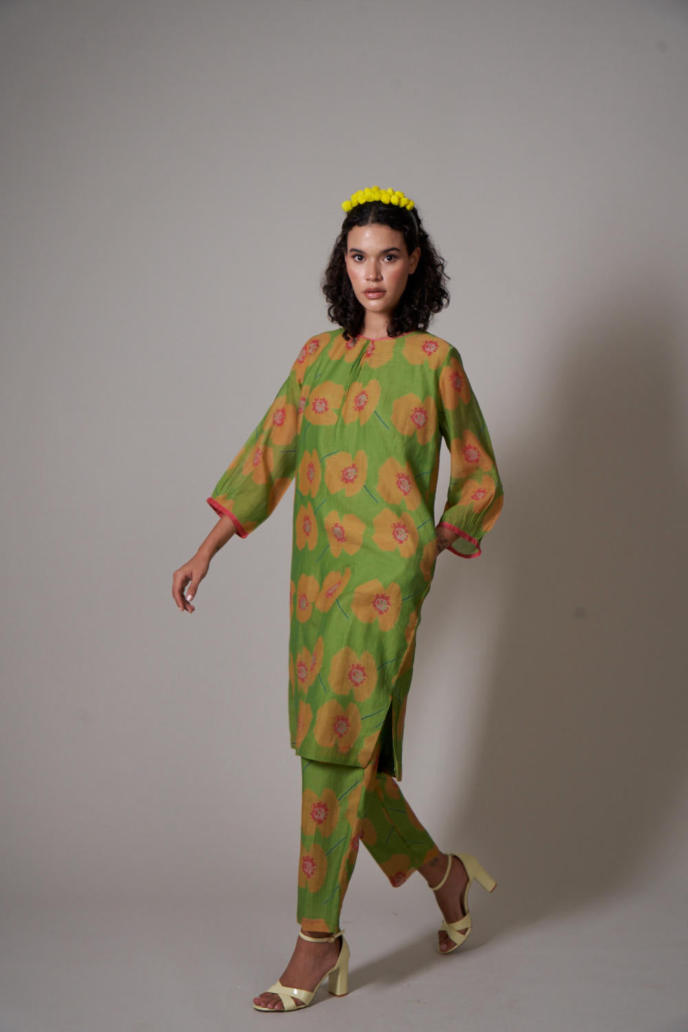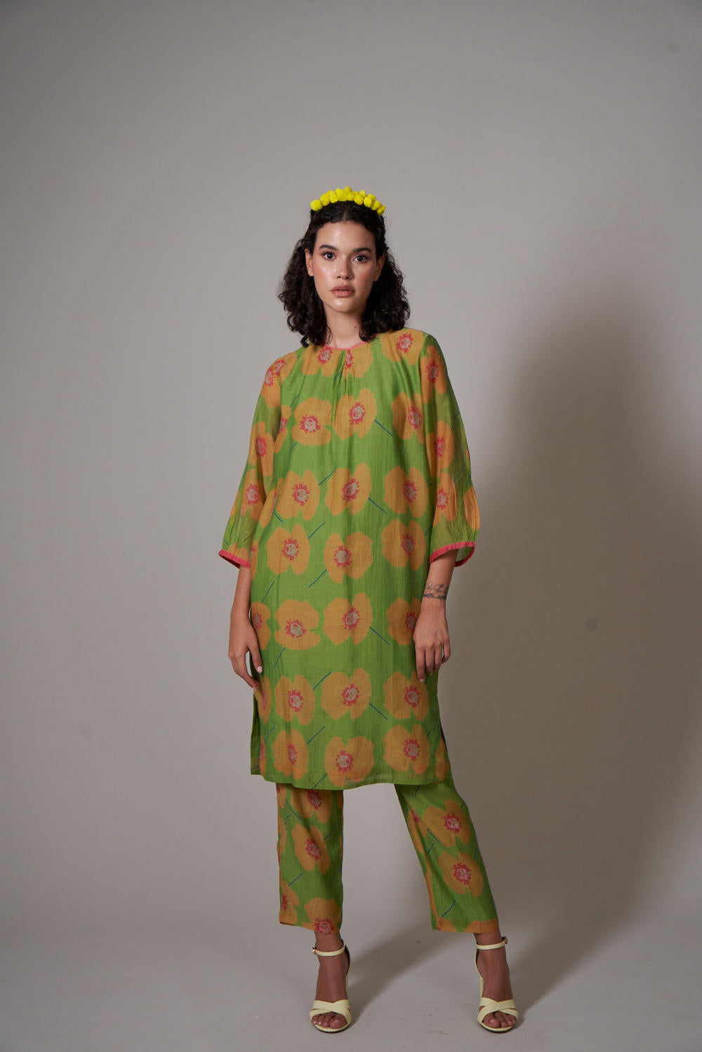 Priti Prashant signature print in Handwoven mul Cotton Silk, round neckline with gathers,side pockets, Co-ord set .