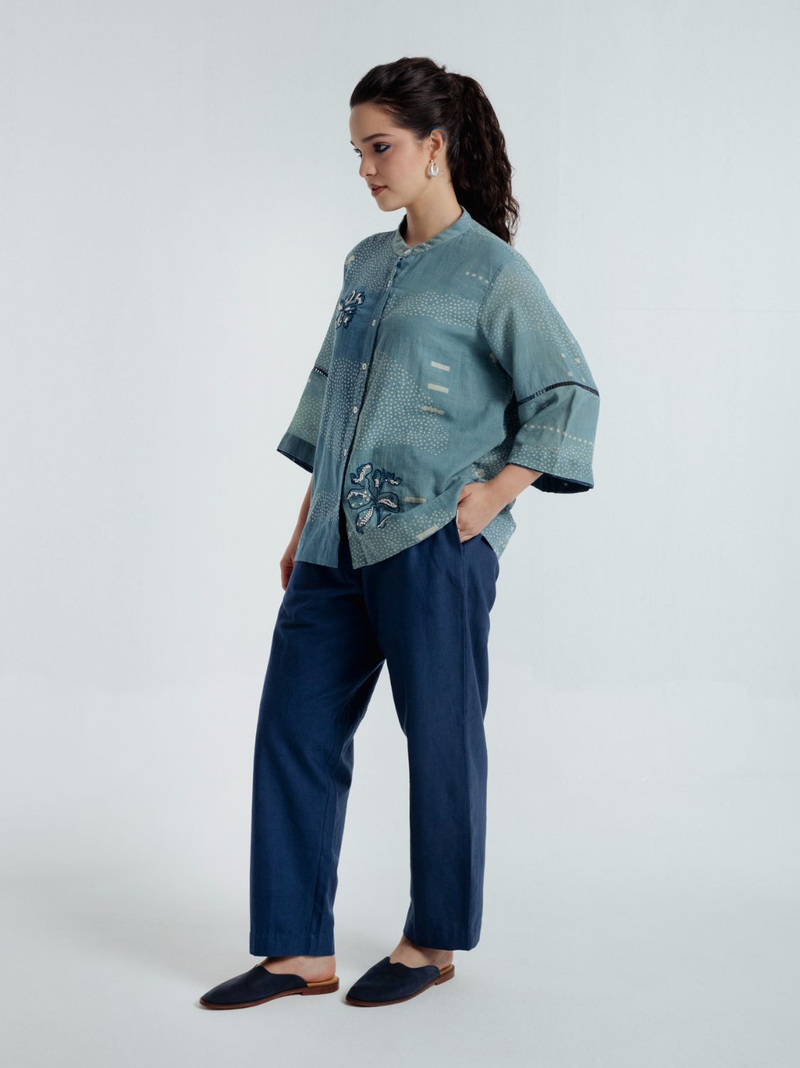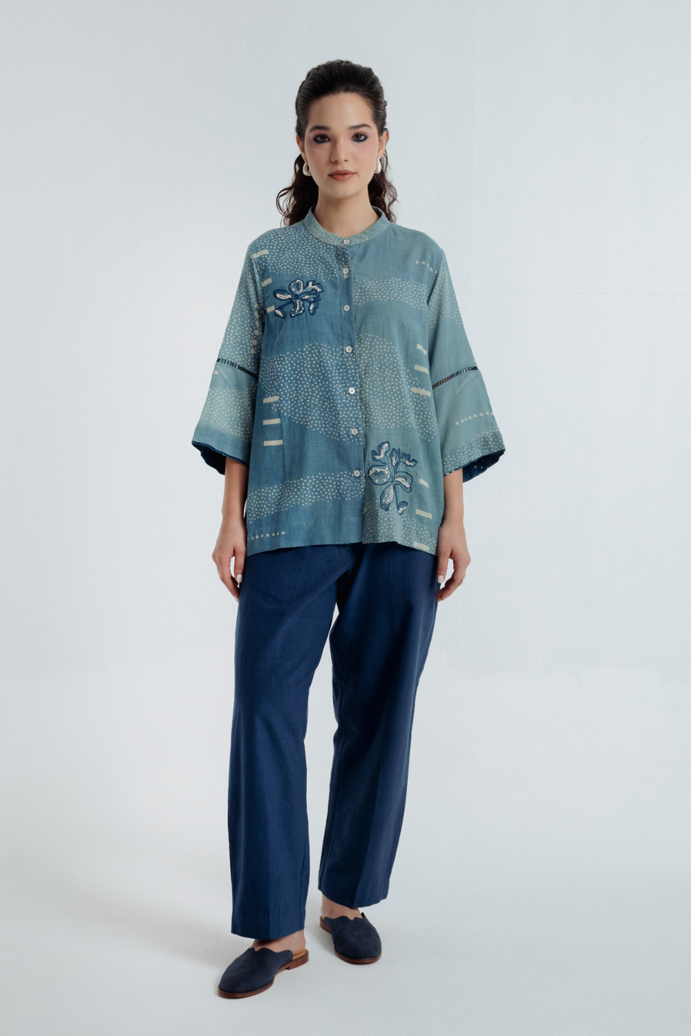 Delicate blue and white hand embroidered french knots making dots and lines, arranged in subtle organic motifs, add a quiet charm, while big Dabbu patterns create depth and engineered placement. Two embroidered motifs grace either side of the shirt, and natural shell buttons provide a refined finishing touch.