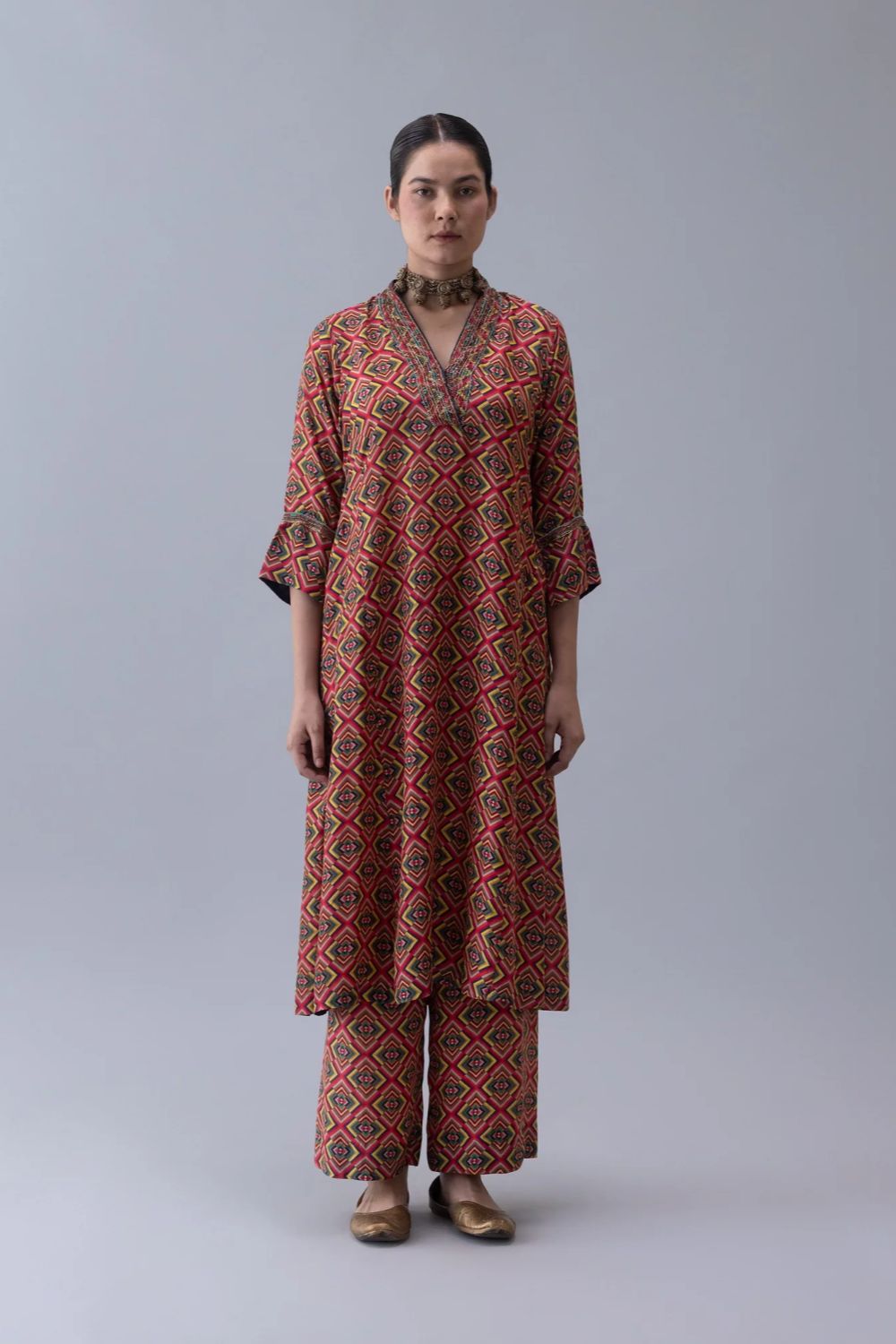 Khamtie kurta in Habutai silk, featuring a vibrant multi-stripe print. A V-neckline with intricate nakshi, dabka, and beadwork pairs with indigo facings and embroidered cuffs, creating a contemporary yet refined silhouette. Country of origin: India