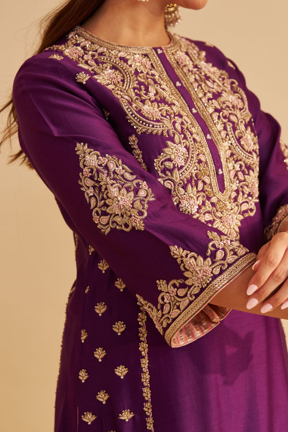 This regal long A-line ensemble is crafted in luxurious pure silk chanderi, paired with flowing palazzos and a delicate silk organza dupatta. The silhouette features a zero neckline with placket and three-quarter bell sleeves, combining elegance with contemporary charm.