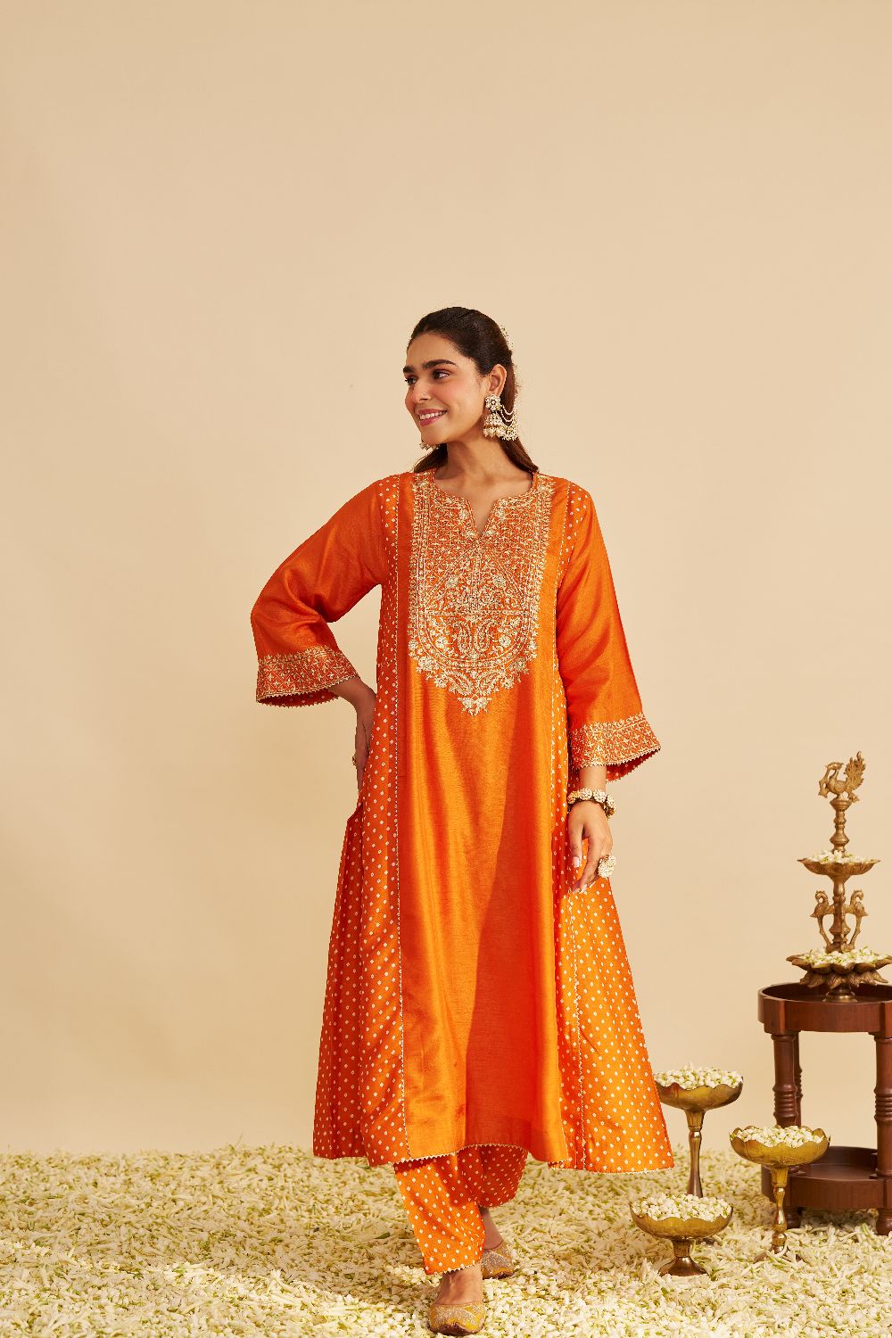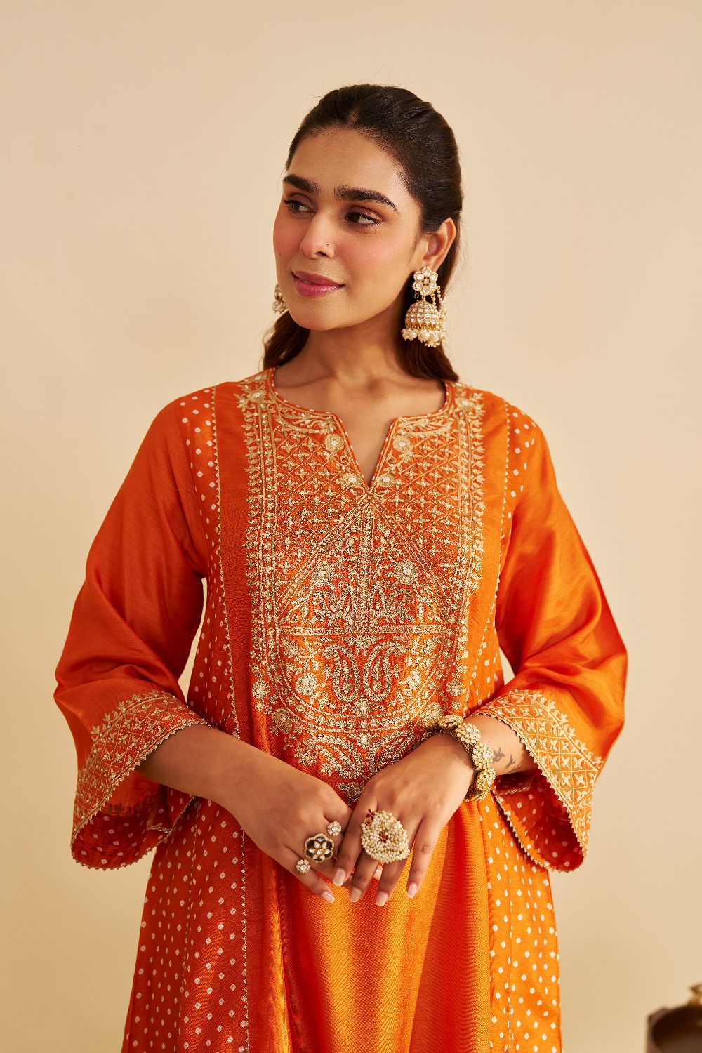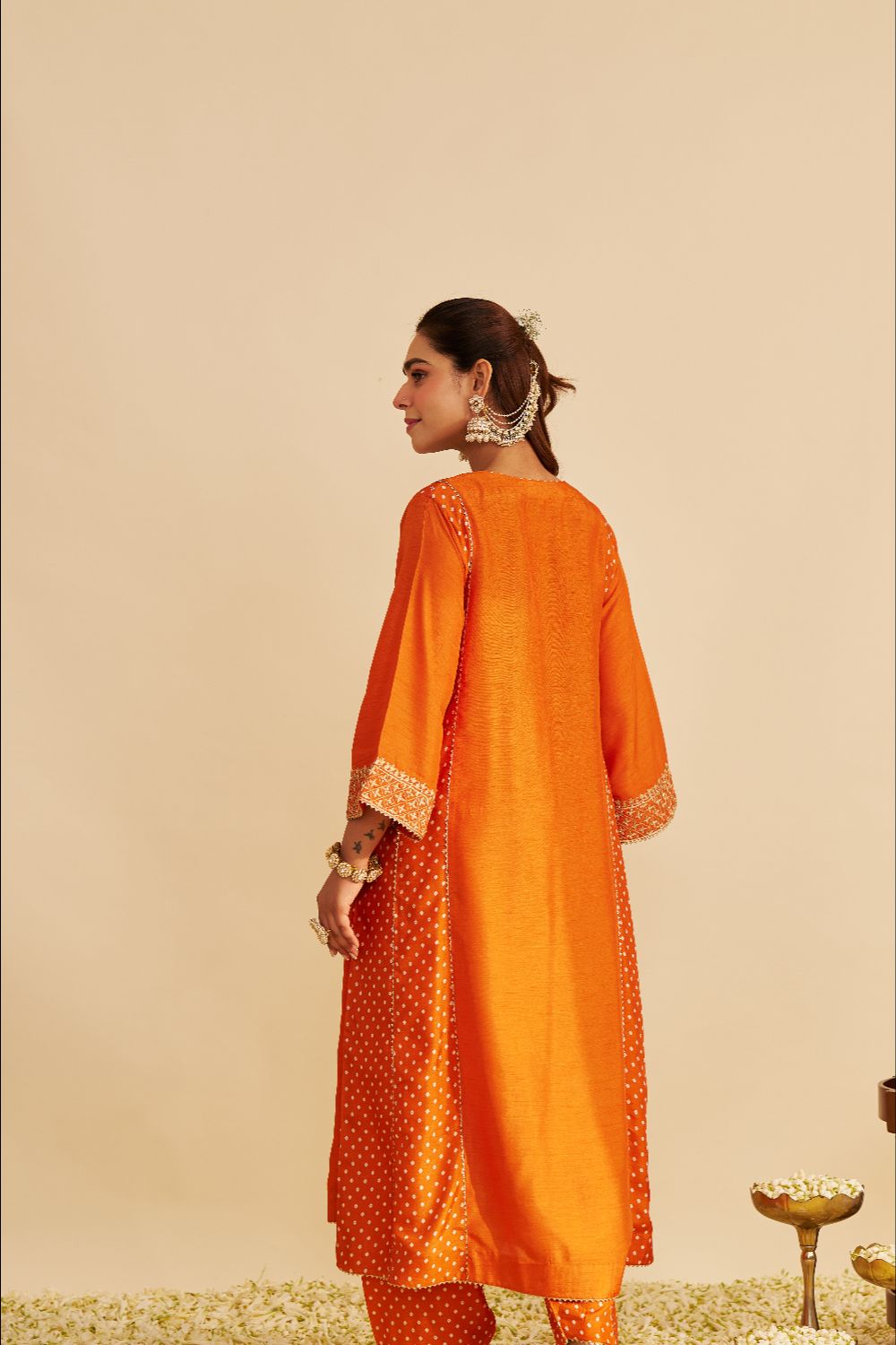 Paired with a traditional Dogri salwar, the ensemble is finished with Bandhej and gota detailing, blending artisanal charm with sophisticated style.