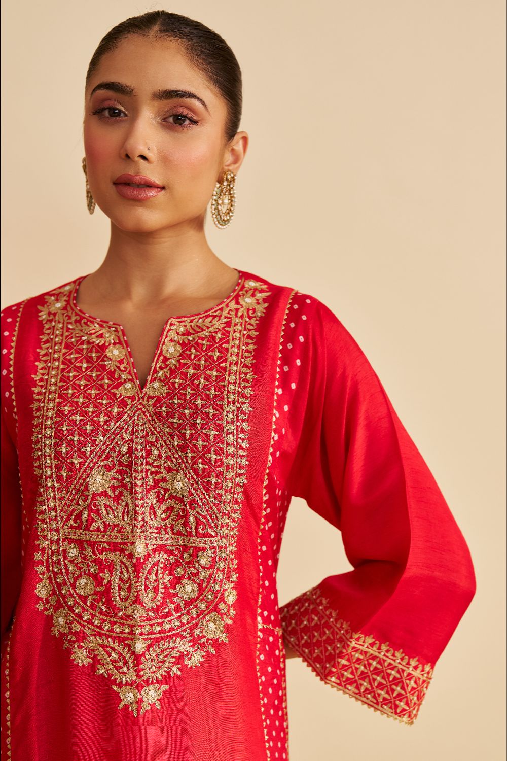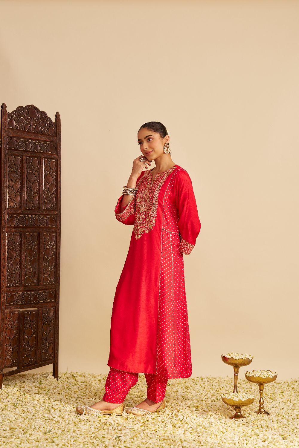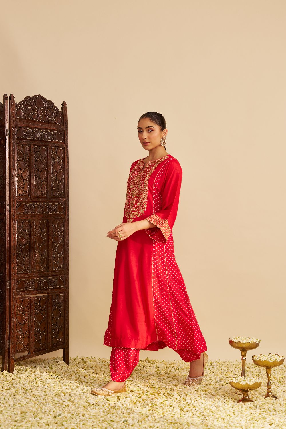 Paired with a traditional Dogri salwar, the ensemble is finished with Bandhej and gota detailing, blending artisanal charm with sophisticated style.