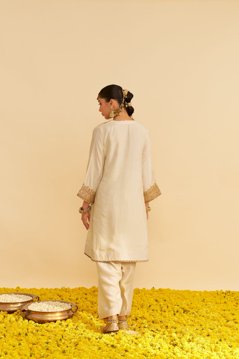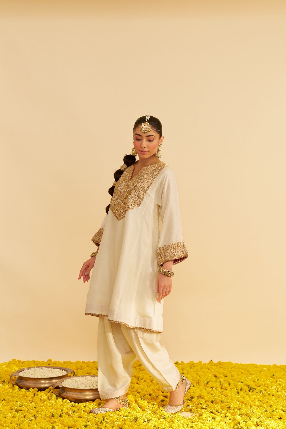 It features a zero neckline with a slit, and three-quarter bell sleeves finished with classic Kiran detailing. Paired with a traditional Dogri salwar, the outfit is completed with a contrasting Banarasi fabric, enhancing its overall opulence and timeless appeal.