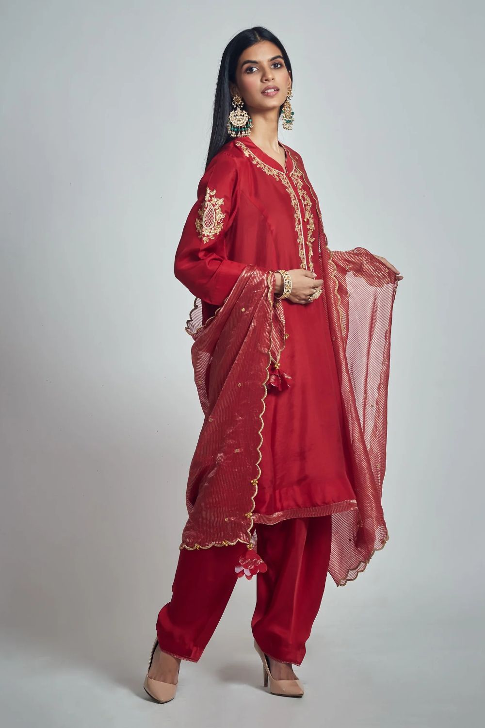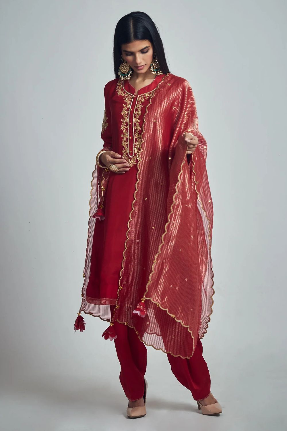 Kurta - Habutai Silk; Salwar - Silk; Odhni - Silk organza tissue