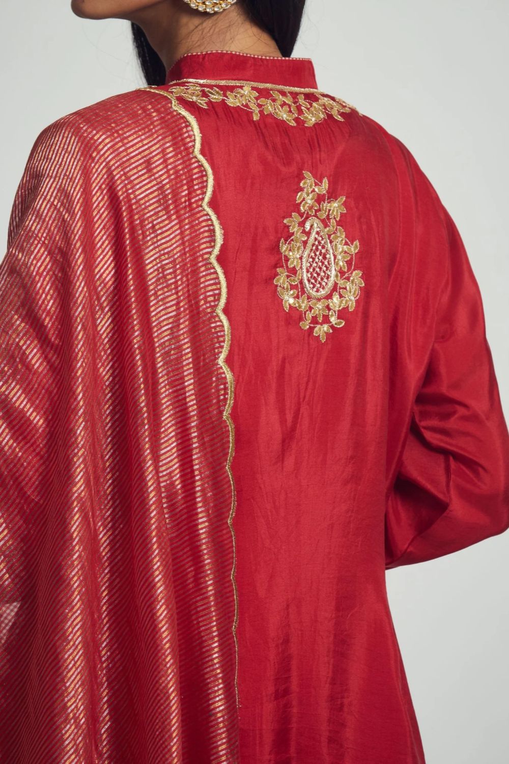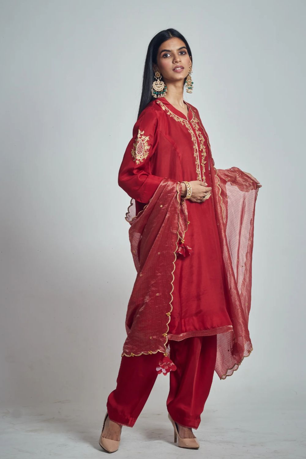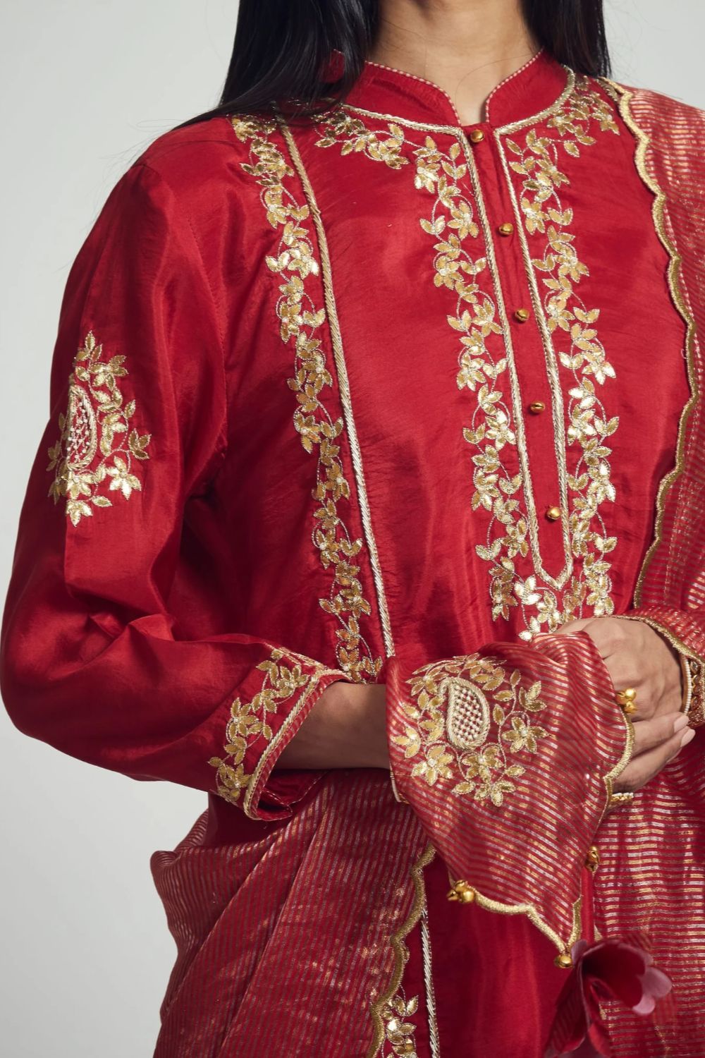 The Nazish ensemble from our Itr collection is made in pure Habutai silk adorned with heritage gota patti, dabka, kasab and pearl embroidery. It features a mandarin collar with potli buttons and full sleeves. The look comes with salwar and a silk organza tissue dupatta. The finishing of whole outfit is done using silk organza tissue. Get a matching belt to complete your look.
