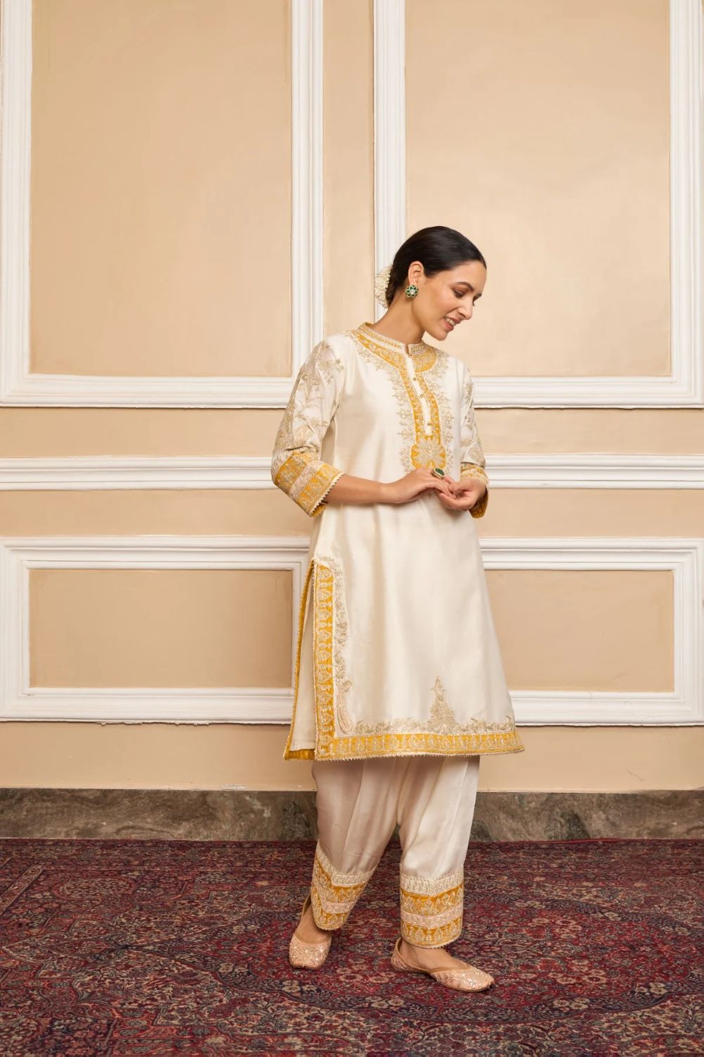 This ensemble is made in pure silk chanderi fabric and adorned with heritage Kashmiri Tilla Embroidery. It features a collar with placket, three-quarter bell sleeves. The salwar will have an embroidery border at hem. The whole ensemble is highlighted with appliqué, gota and is finished using a chanderi silk banarsi fabric and gota. The dupatta is finished is finished with kinari.