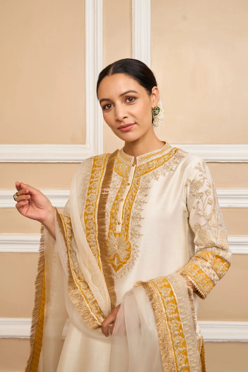 Each garment carries her signature balance — delicate motifs, fluid silhouettes, and a fit that feels custom even before tailoring begins. Her embroideries are intricate yet airy, expressive yet elegantly understated.