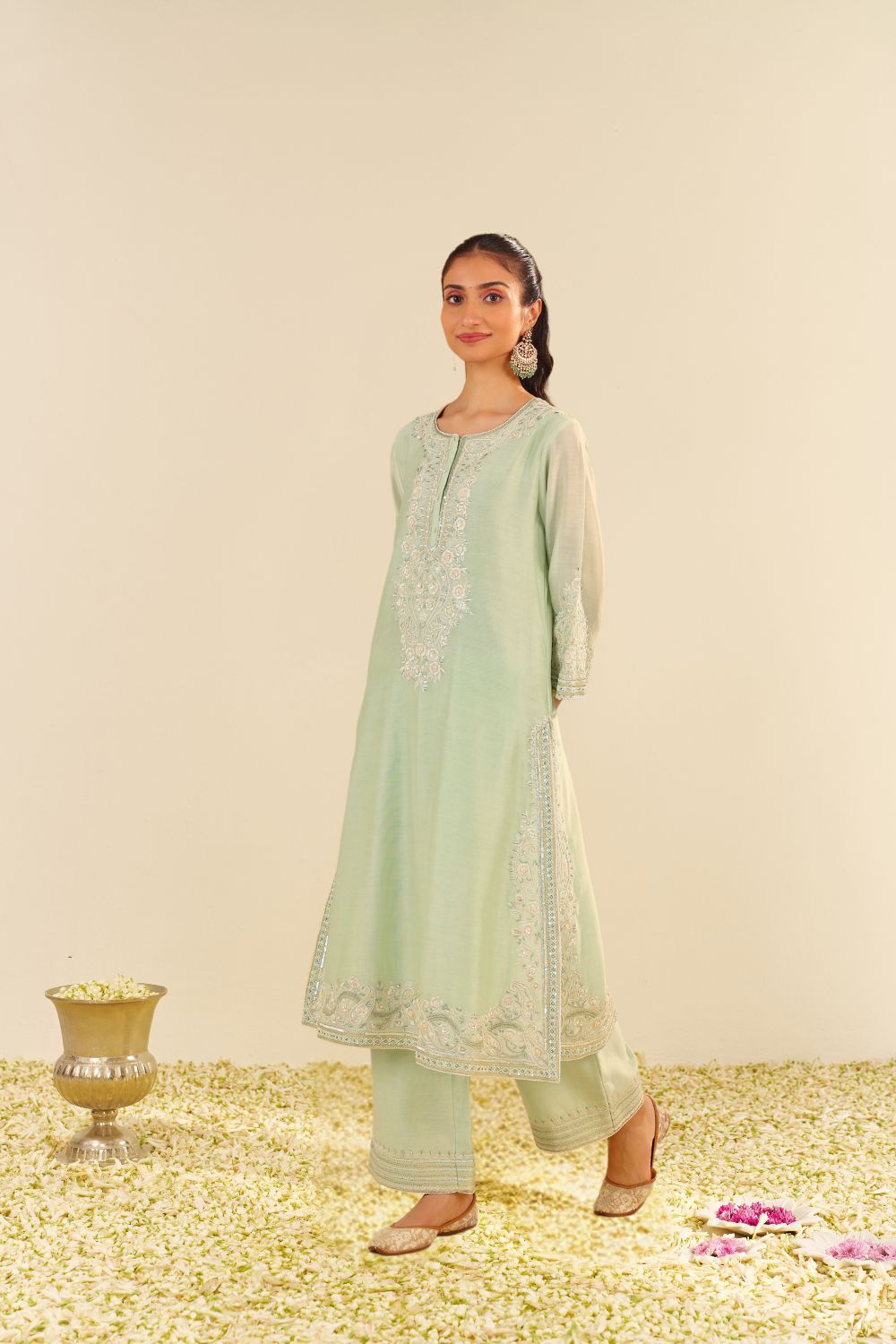 Each garment carries her signature balance — delicate motifs, fluid silhouettes, and a fit that feels custom even before tailoring begins. Her embroideries are intricate yet airy, expressive yet elegantly understated.