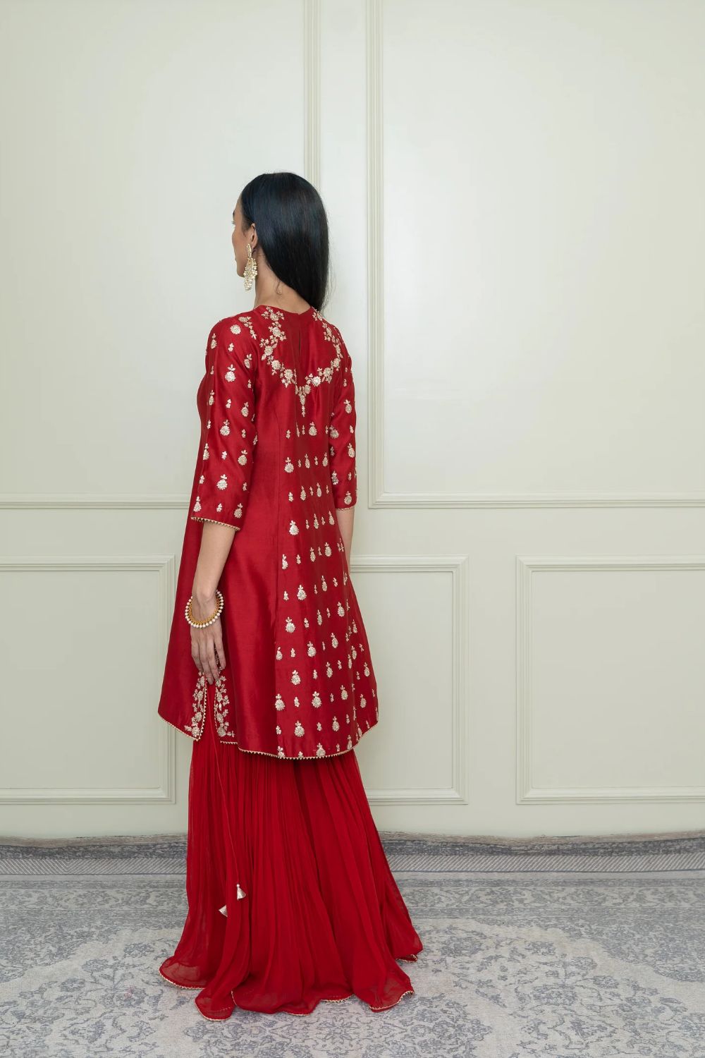 The Shahira emsemble is enhanced with our signature Kashmiri Tilla embroidery. It features a princess-cut A-line kurta with zero neck and three-quarter sleeves. The kurta is teamed up with a crushed garara. The centre panel is highlighted with very fine bootis. The embroidery is highlighted with very fine ivory pearls. The technique is an age-old tradition & one shall cherished it forever. The outfit is finished using a chanderi silk banarsi fabric and gota.
