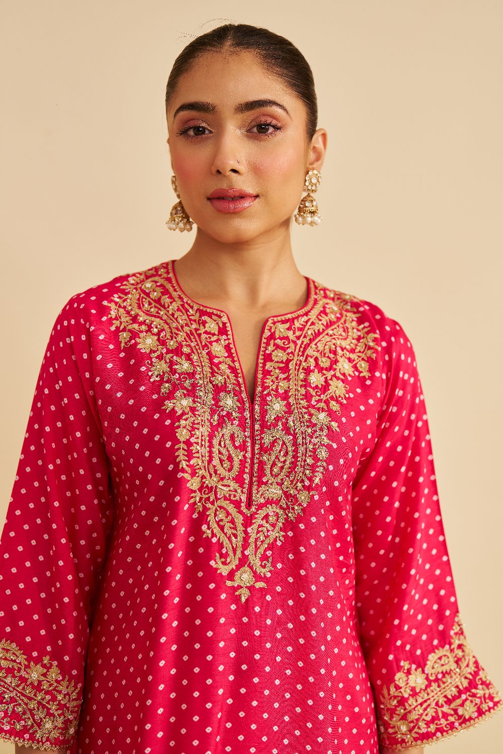 The outfit is finished with delicate gota detailing, adding a festive and timeless charm.