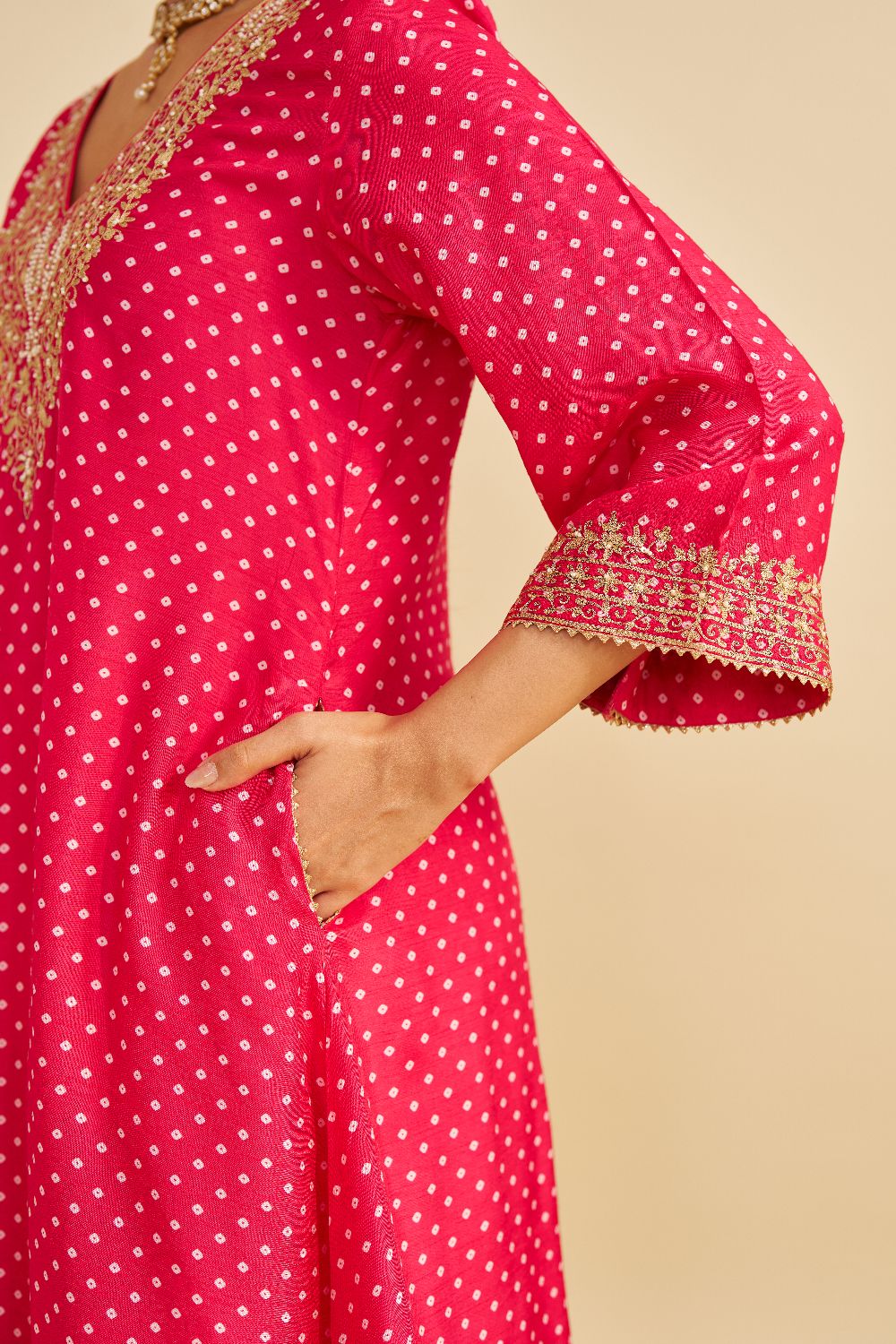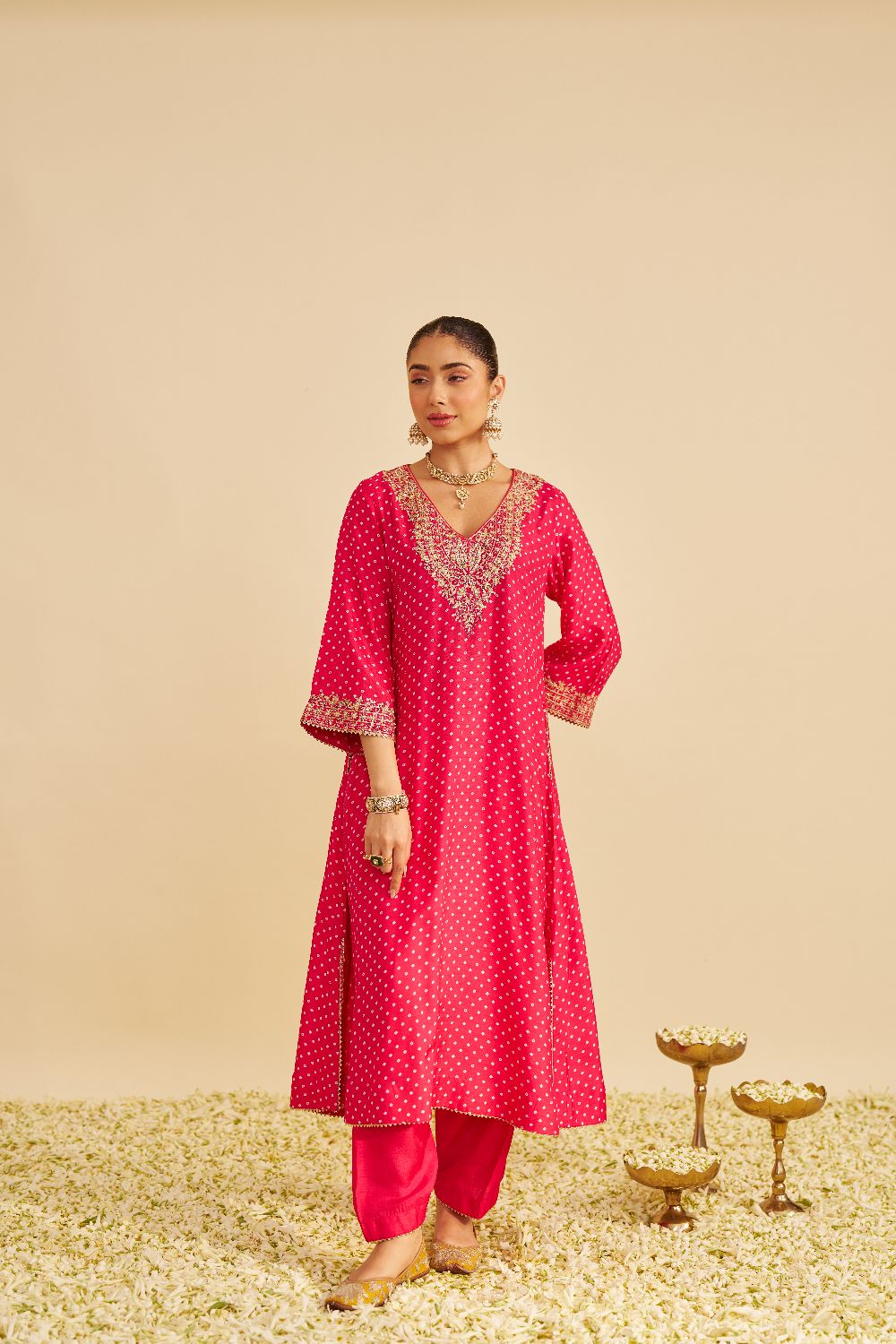 The entire outfit is finished with Bandhej and gota detailing, reflecting a perfect balance of heritage craftsmanship and contemporary elegance.