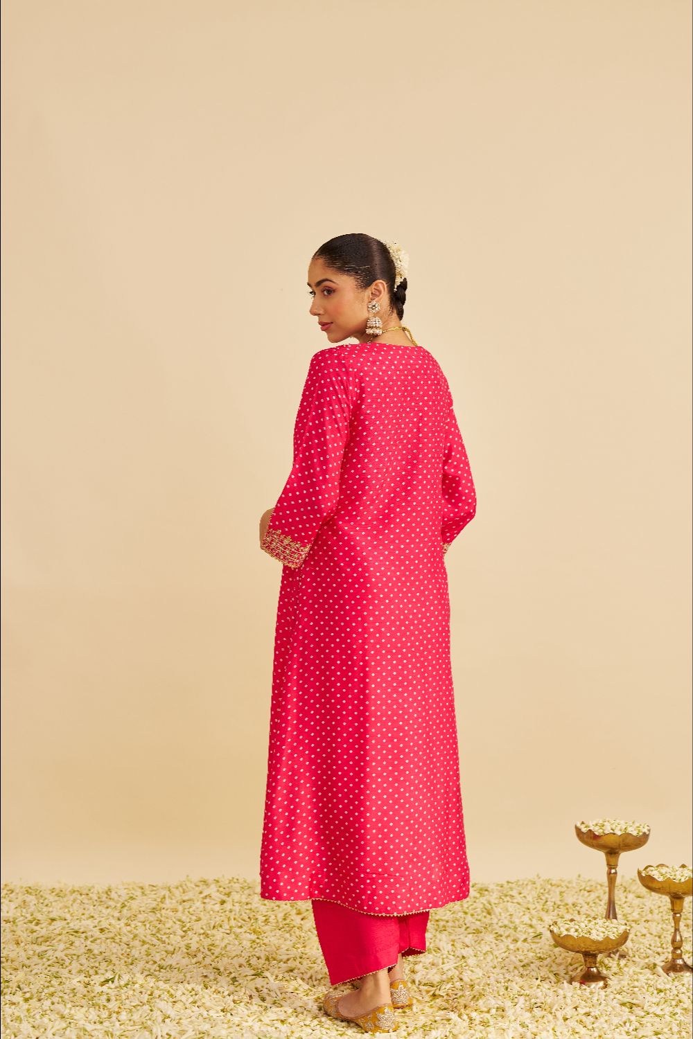 This long A-line kaftan set is crafted in pure Bandhej fabric, offering a vibrant, traditional aesthetic with a modern silhouette. The kurta features a broad and deep V-neckline at the front, a zero neckline at the back, and three-quarter bell sleeves that enhance its fluid, elegant design.