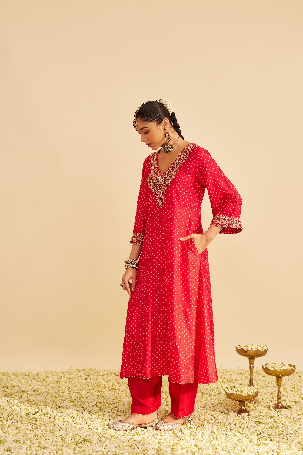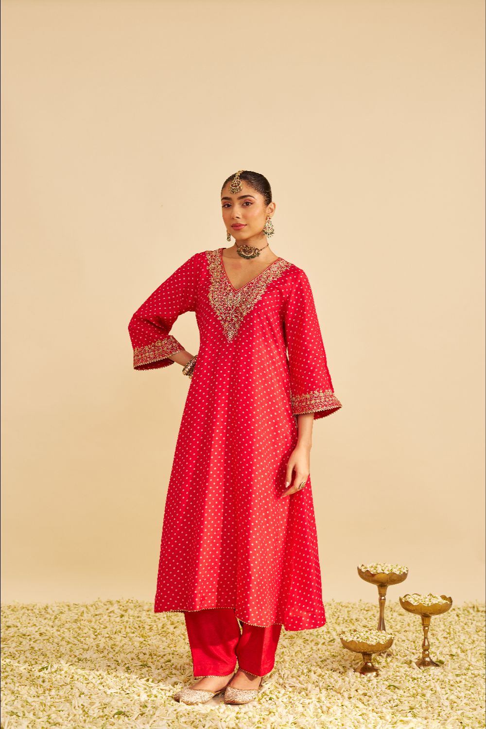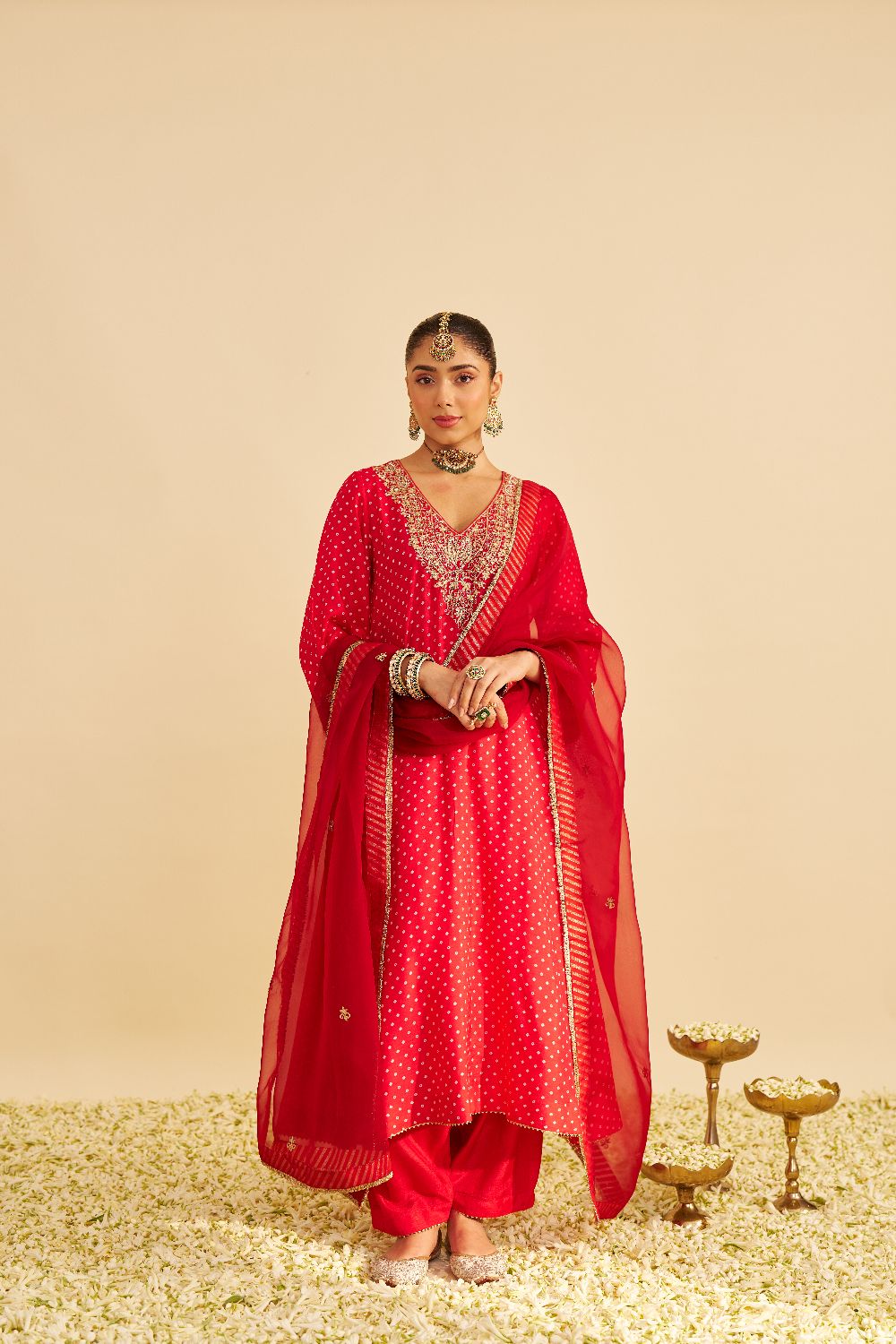 The entire outfit is finished with Bandhej and gota detailing, reflecting a perfect balance of heritage craftsmanship and contemporary elegance.