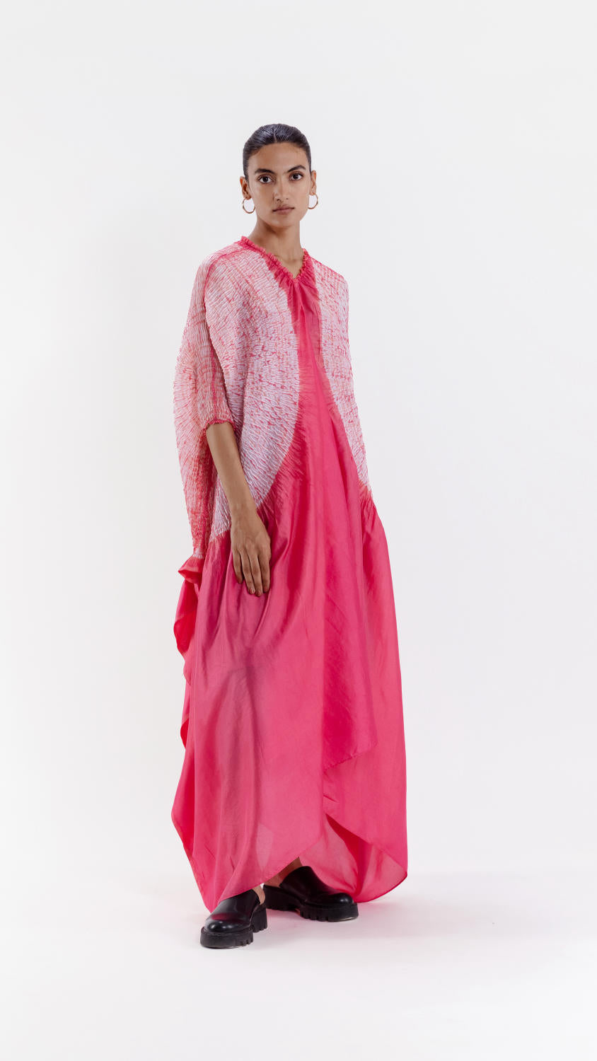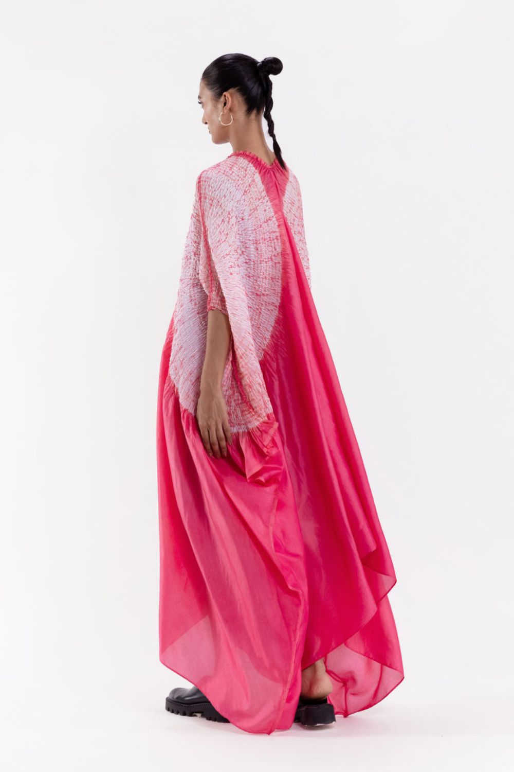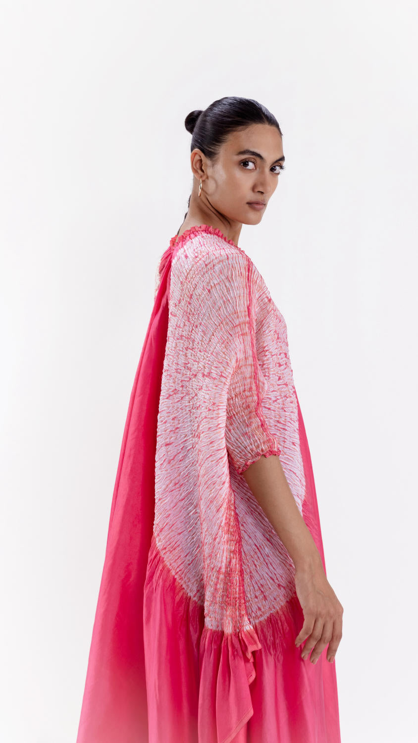 Freesize handwoven silk dress dyed in pink, with our signature shibori sleeve detail.