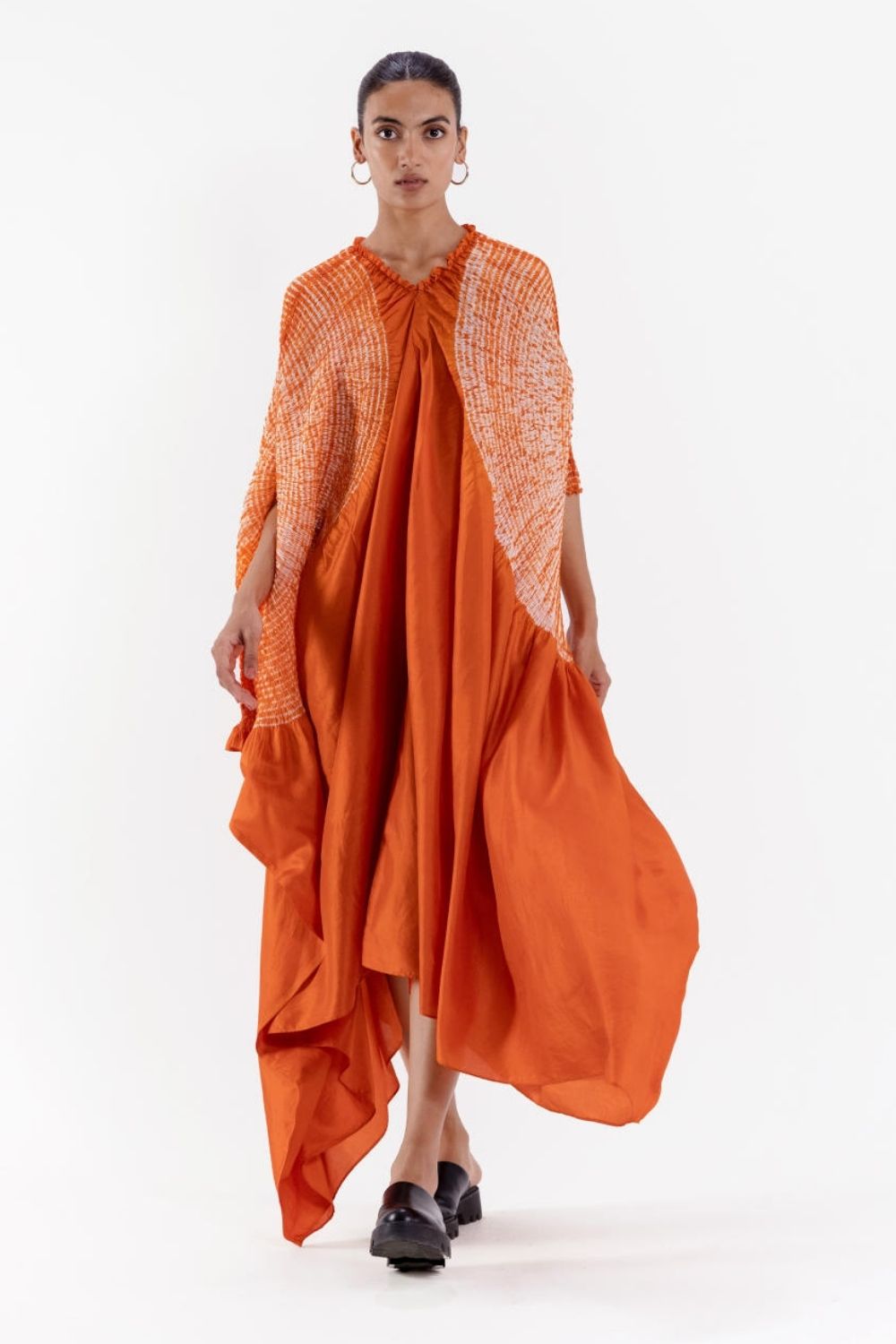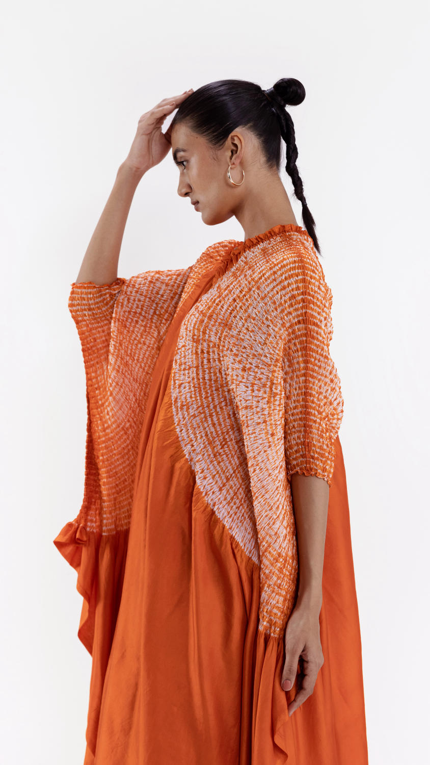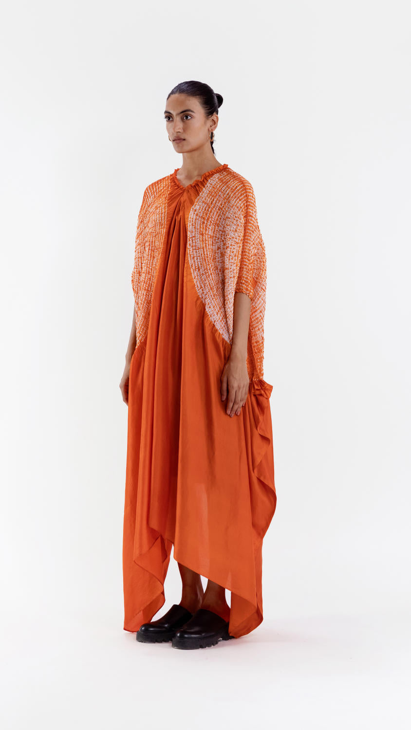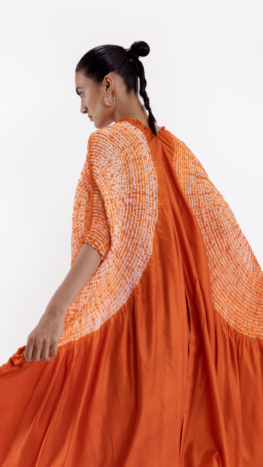 Freesize handwoven silk dress dyed in rust, with ourr signature shibori sleeve detail.