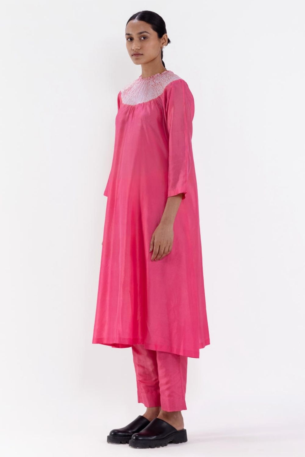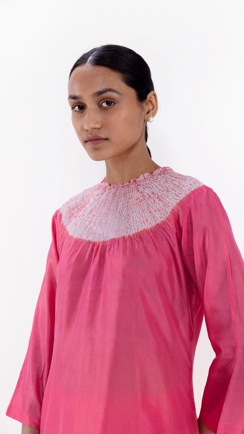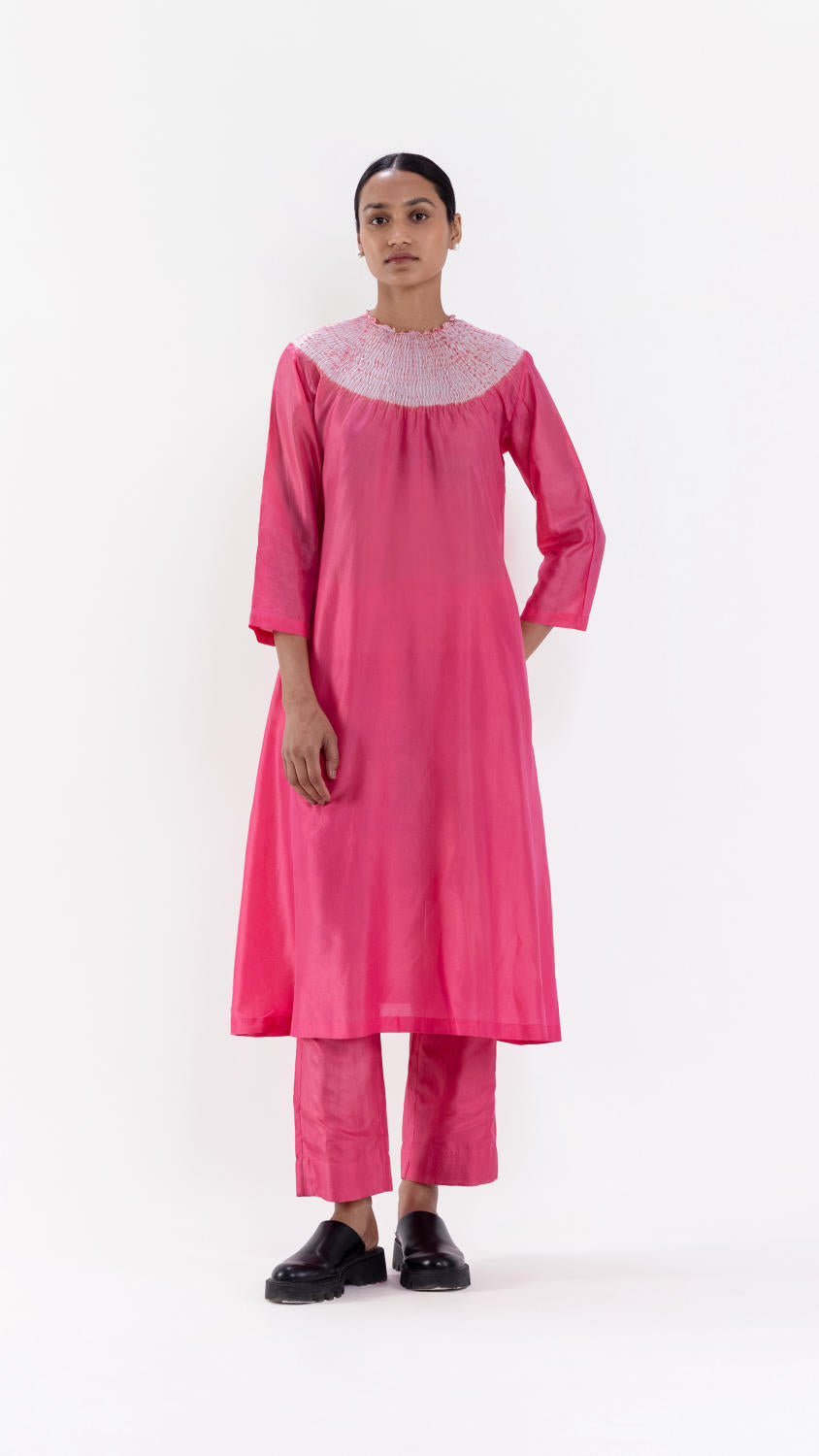 Handwoven silk A-line kurta with our signature shibori neckline and coordinated silk pants.