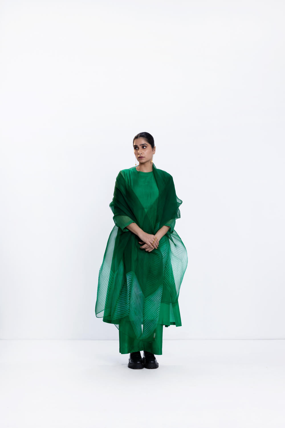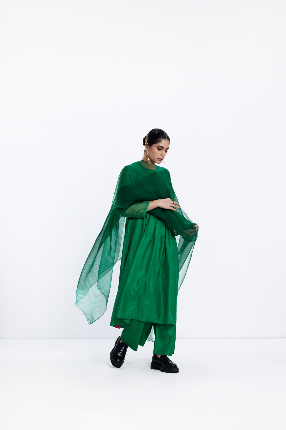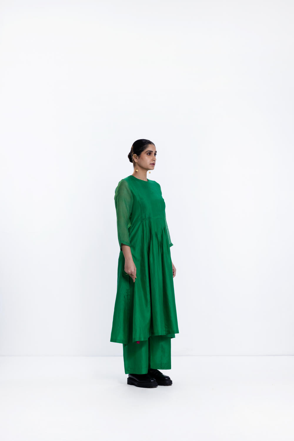 Emerald silk pintuck kurta with high slit and a contrast rani facing. It is paired with wide silk pants in emerald.
