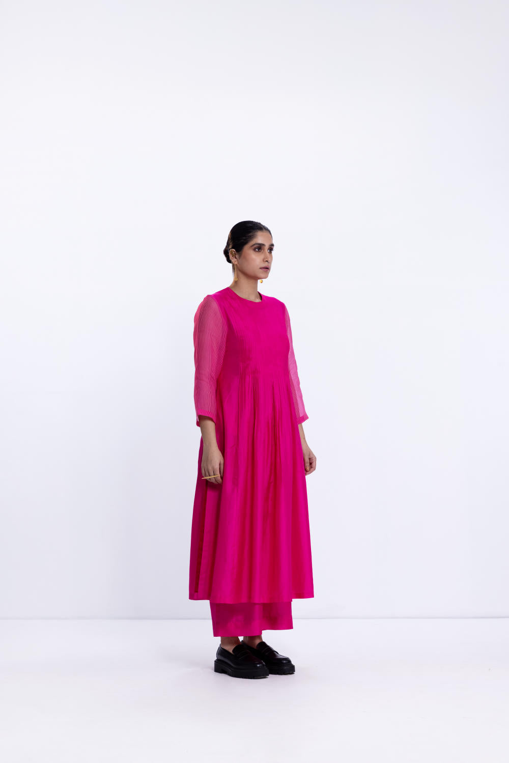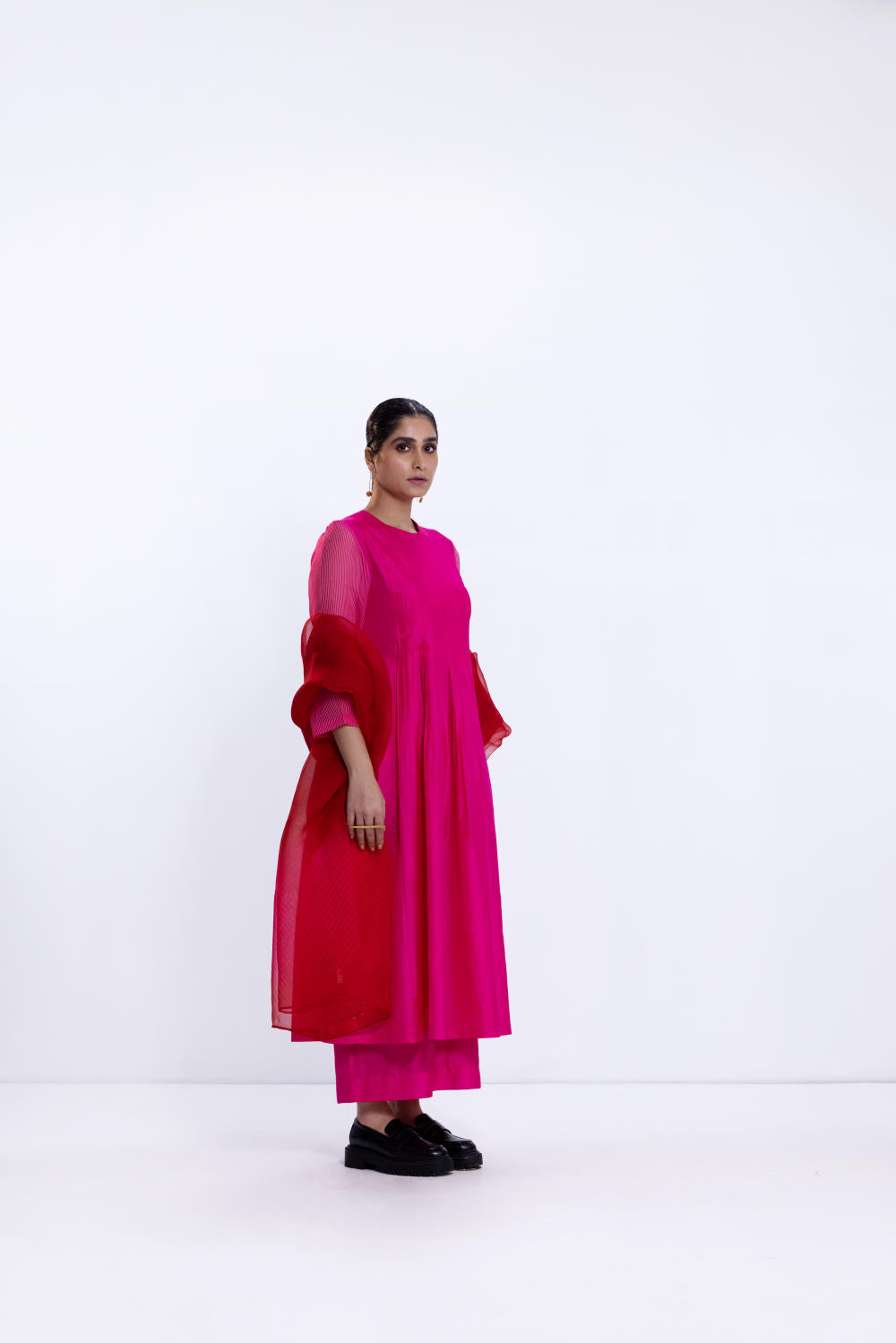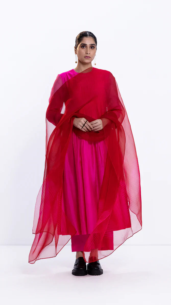 Rani silk pintuck kurta with high slit and a contrast red facing. It is paired with wide silk pants in rani.