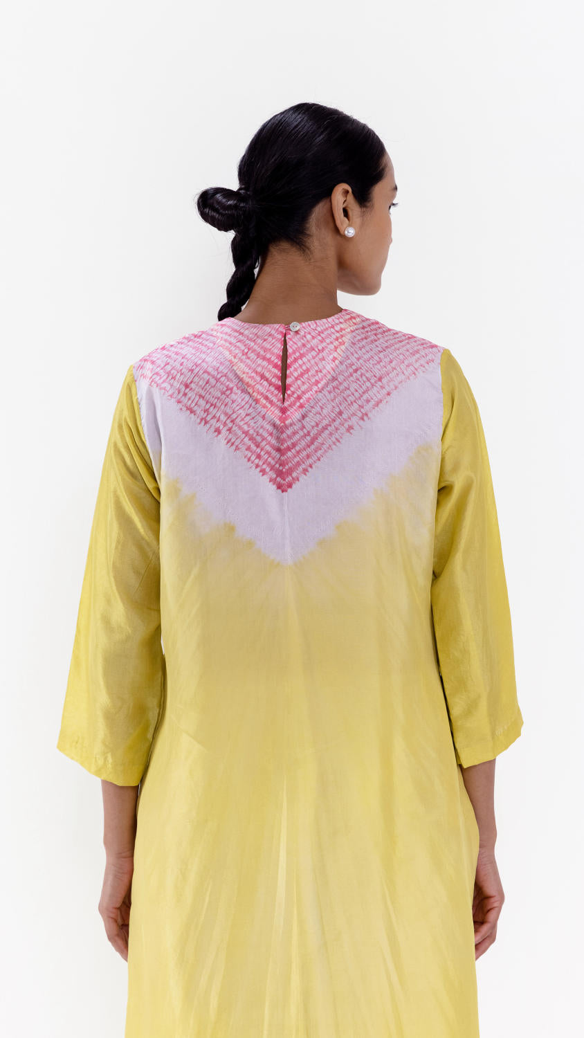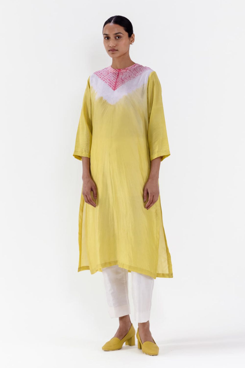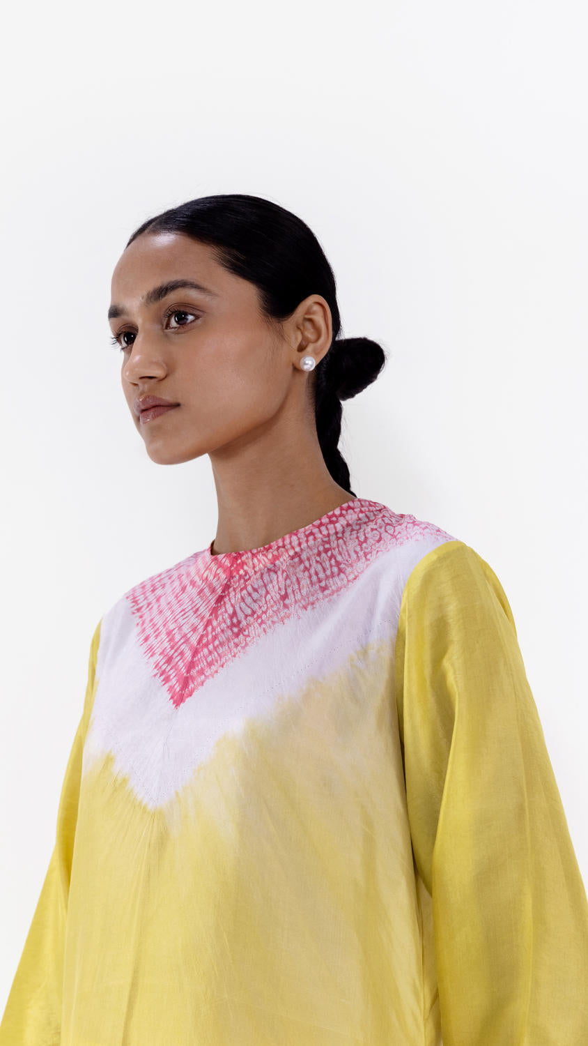 Handwoven silk shibori kurta hand-dyed in shades of lime and pink, with our signature shibori detail on the neckline coordinated silk pants.